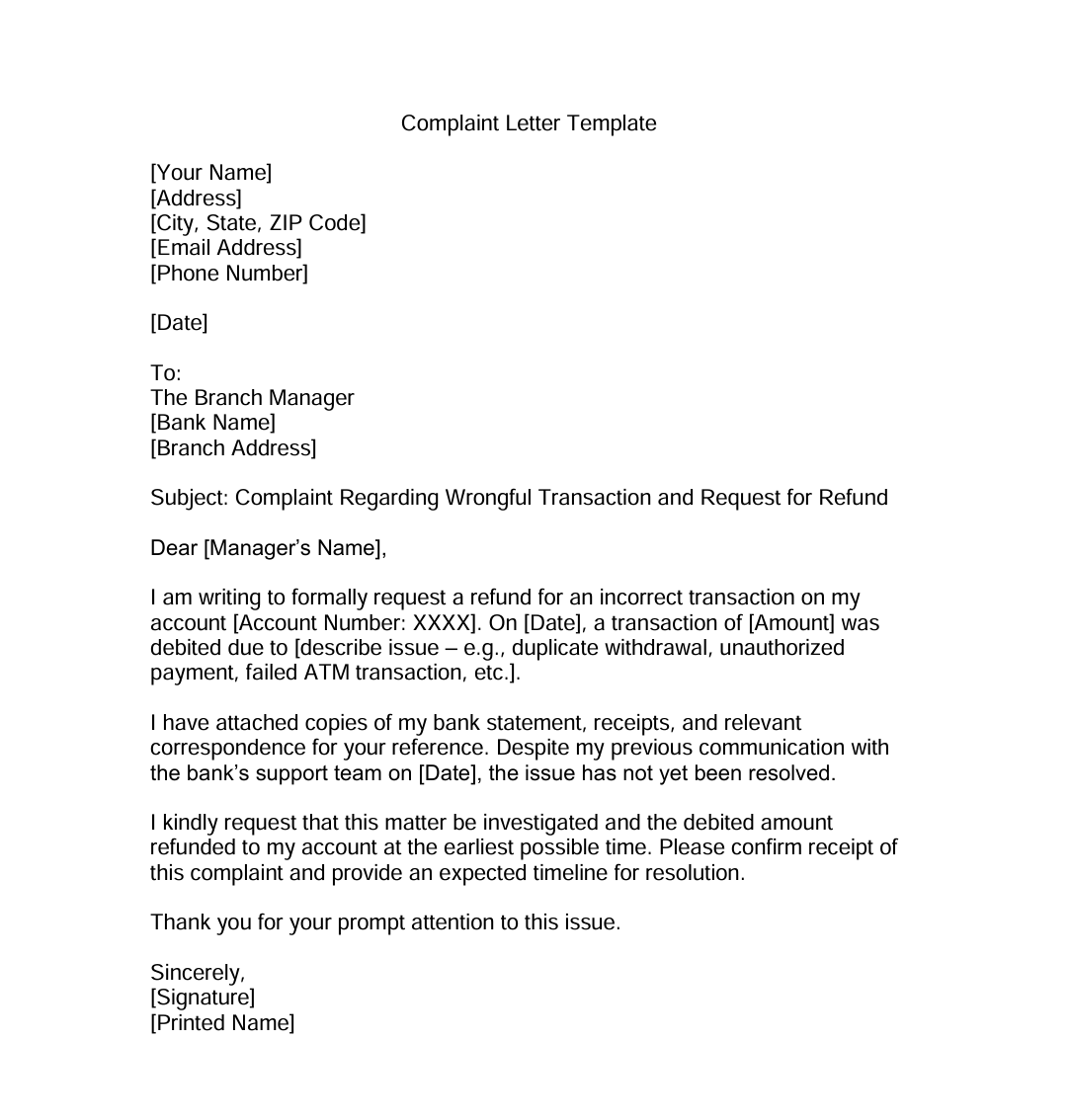 Complaint Letter Template