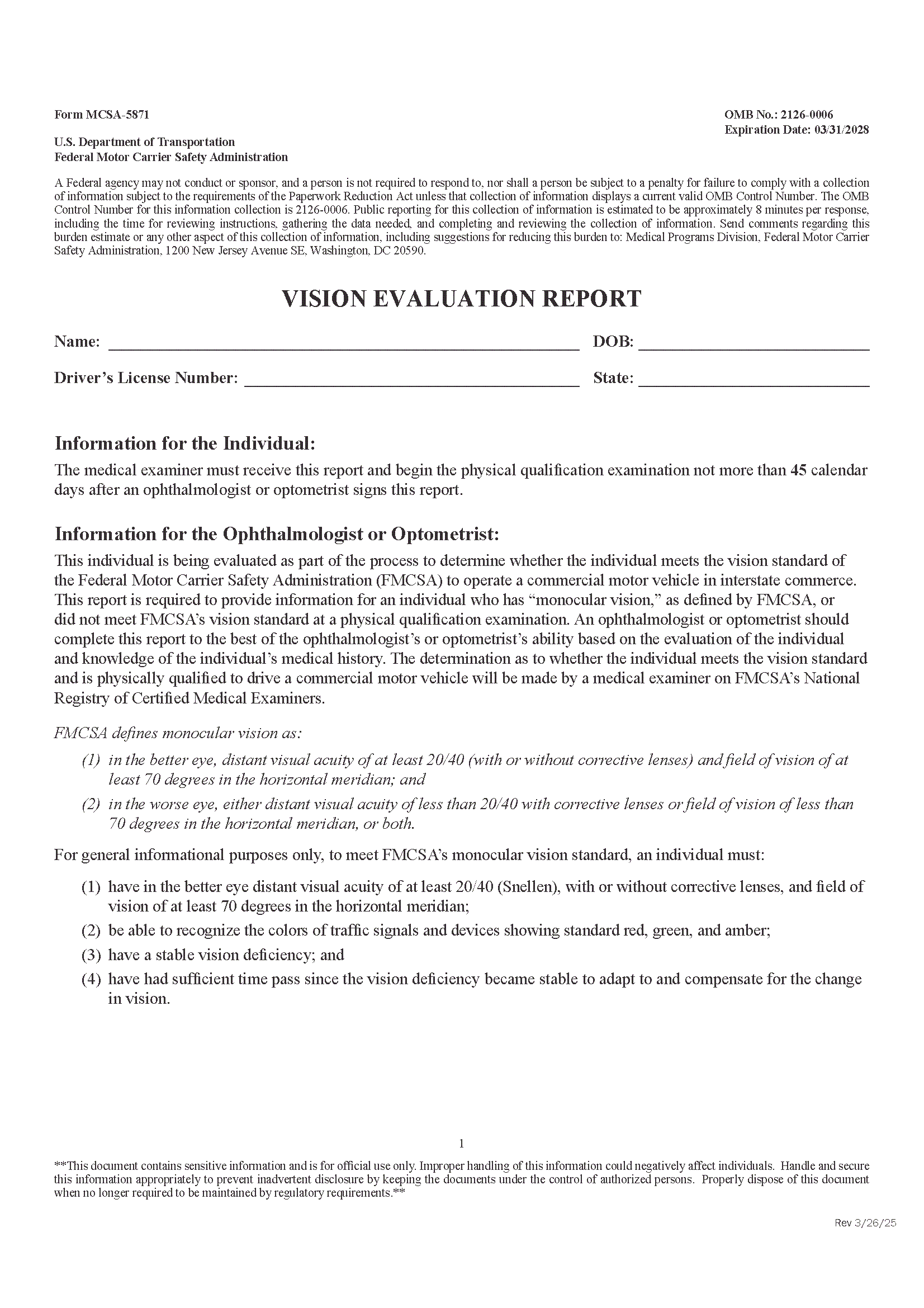- Any previous FMCSA vision evaluation forms