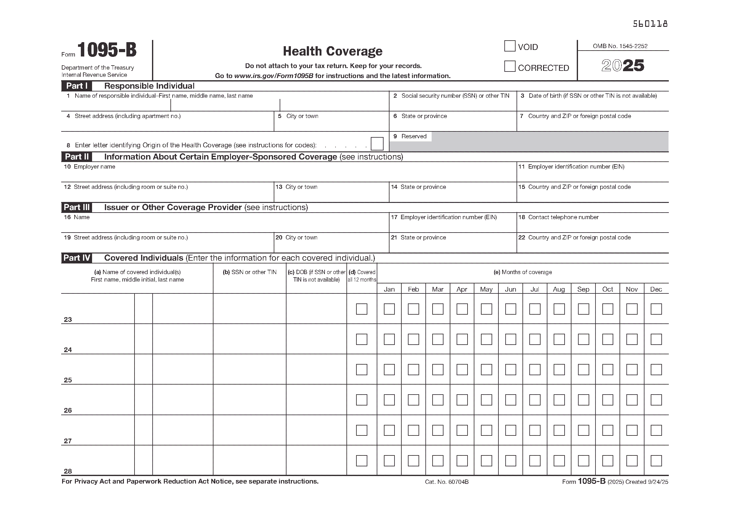 Form 1095-B is used only for coverage reported by insurers, government programs, and certain plan sponsors. Coverage obtained through a Health Insurance Marketplace is reported on Form 1095-A, while coverage offered or provided by applicable large employers is reported on Form 1095-C. Each form corresponds to a separate reporting system.