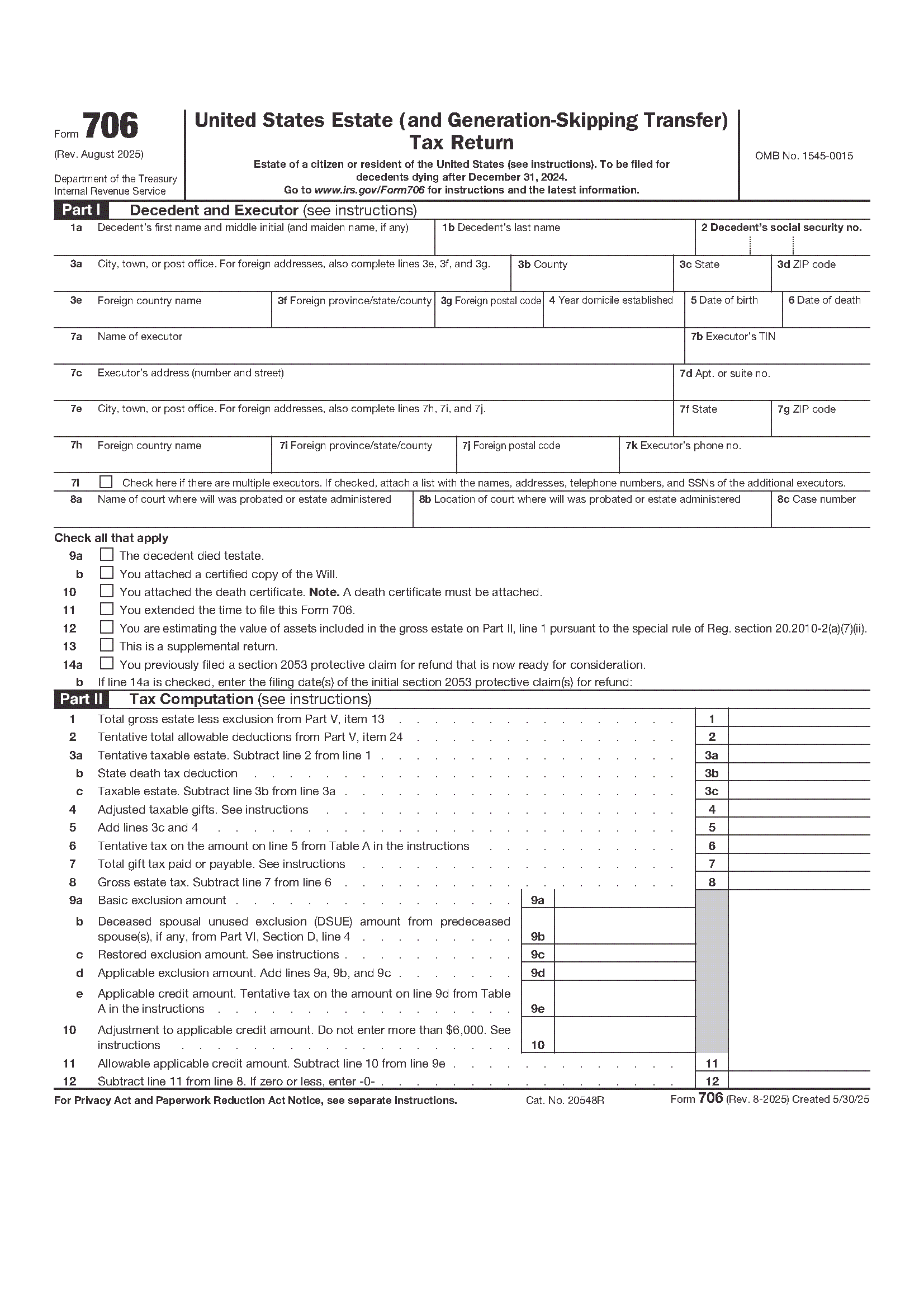 Form 706 operates as a structured reporting framework rather than a single calculation. Property interests connected to the decedent are identified and reported across multiple schedules according to asset type and legal classification. After the gross estate is established, the form applies allowable reductions, deductions, exclusions, and credits before producing a final estate tax and GST tax result.