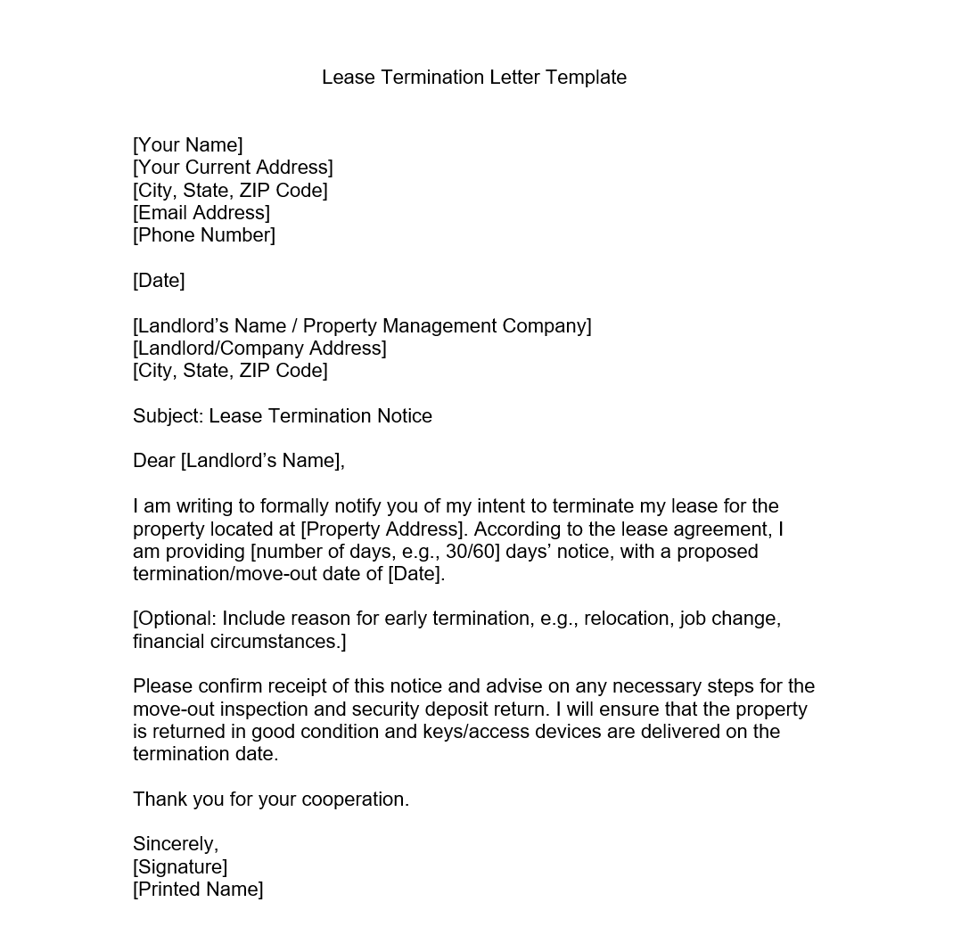 I am writing to formally notify you of my intent to terminate my lease for the property located at [Property Address]. According to the lease agreement, I am providing [number of days, e.g., 30/60] days’ notice, with a proposed termination/move-out date of [Date].