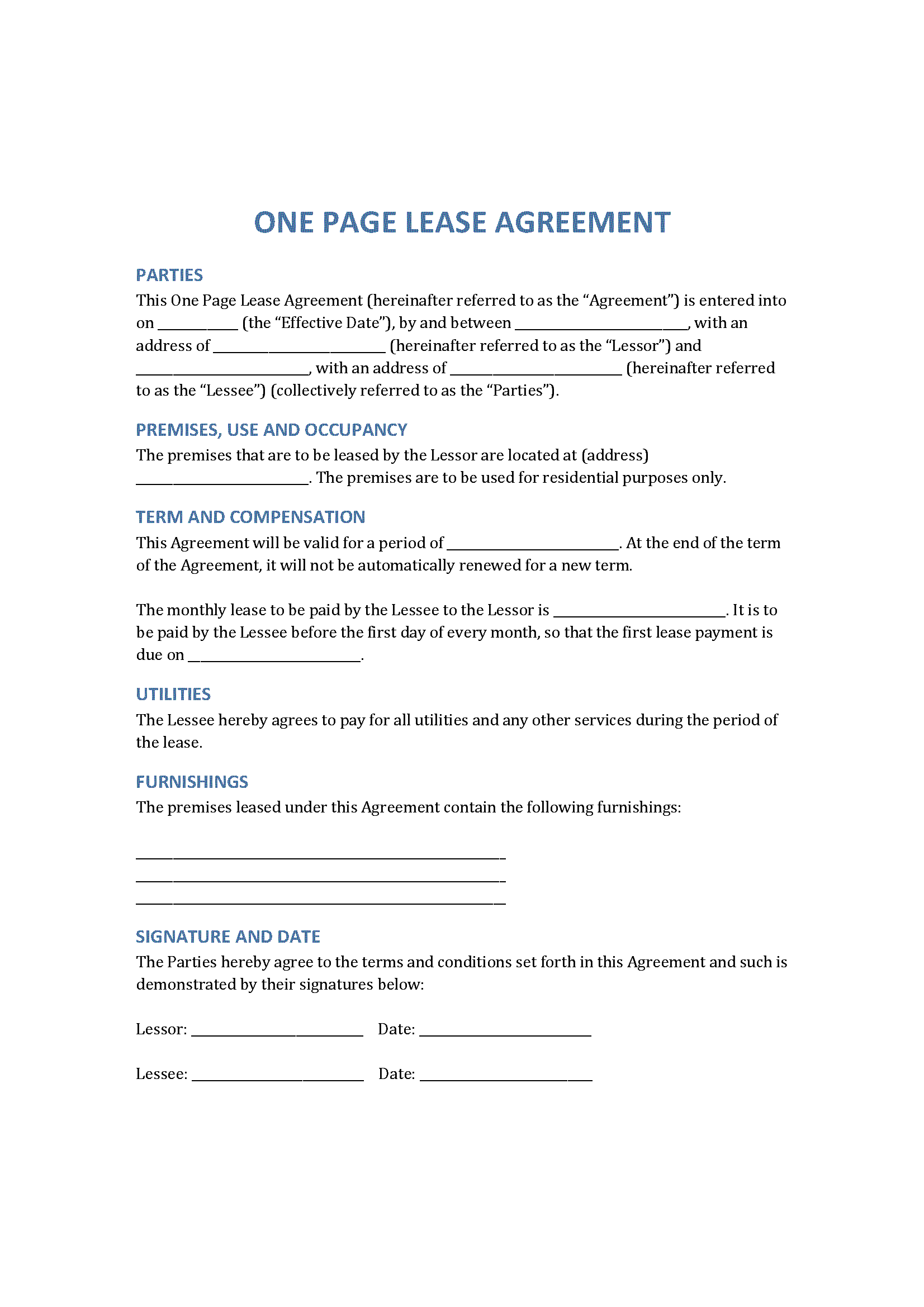 A One Page Lease Agreement is a concise residential rental contract designed for situations where parties need a clear, legally structured lease without excessive clauses or complex legal language. This format is especially suitable for short-term rentals, private landlords, first-time leasing arrangements, or situations where speed and clarity are essential.