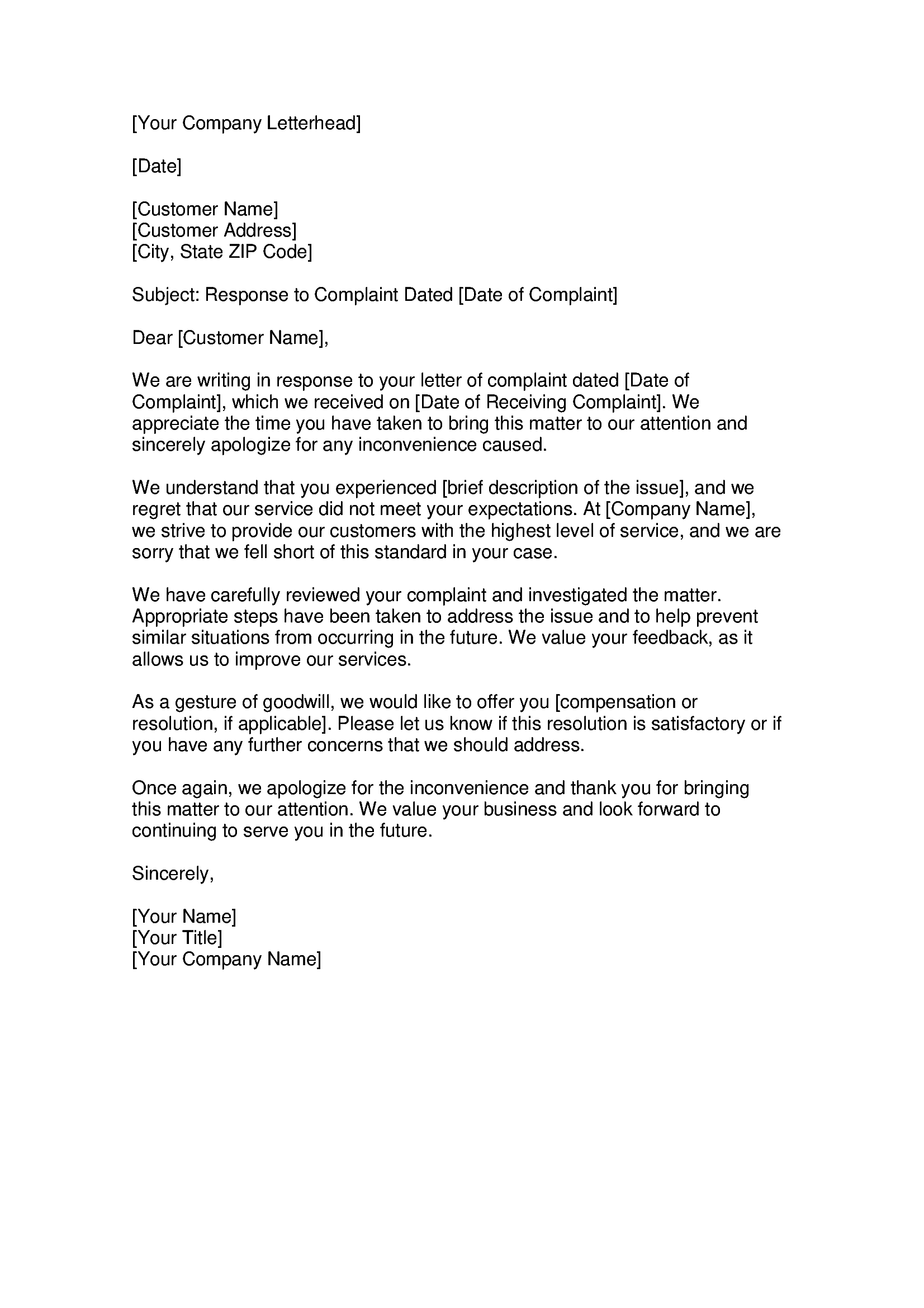 For general examples and background information about responding to complaints, see Response to a Complaint Letter.