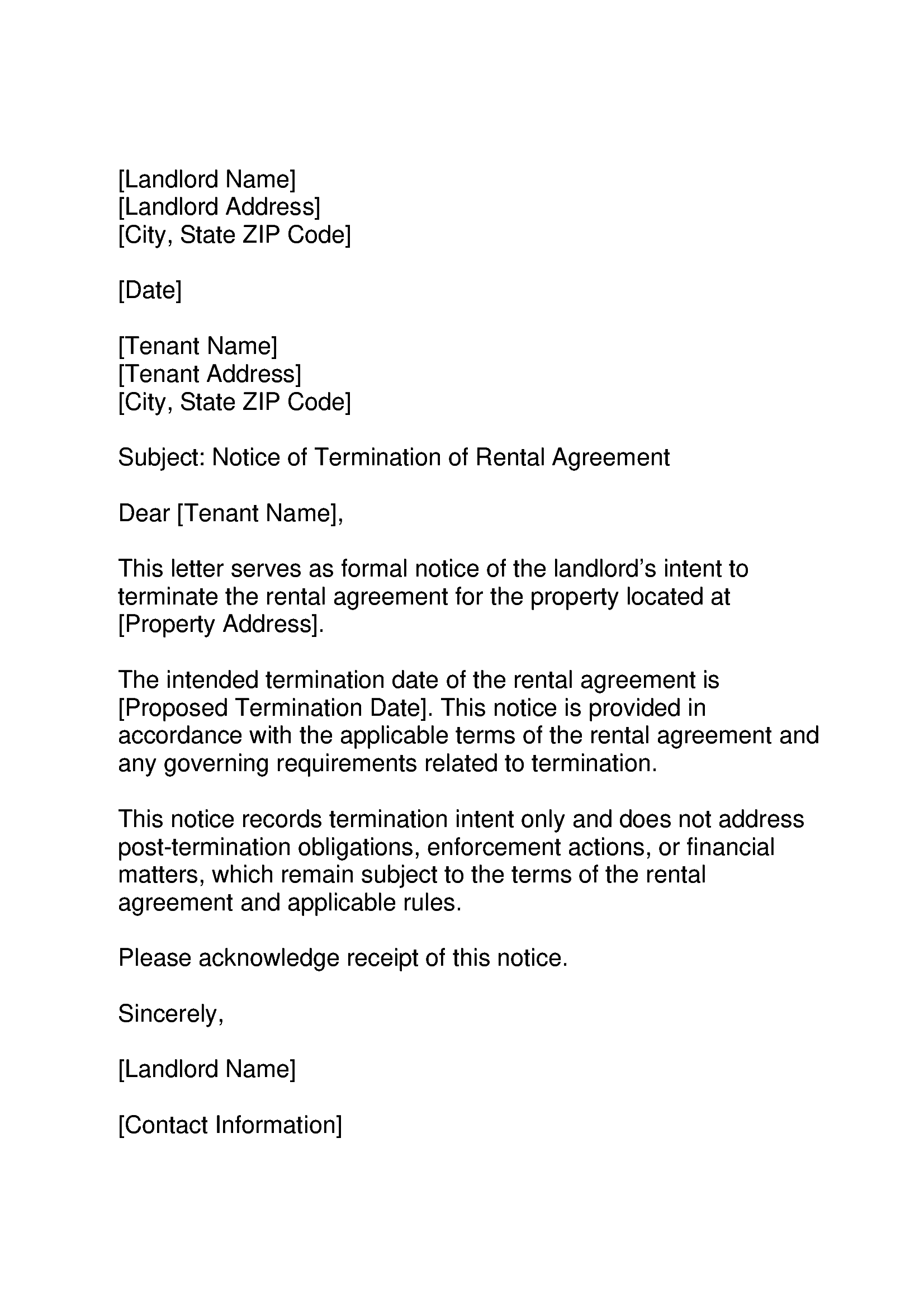 A Termination of Rental Agreement Letter by a Landlord is used when a landlord seeks to bring a rental agreement to an end. Within the lease termination process, the document commonly marks the beginning of a notice period or supports the system’s evaluation of whether landlord-initiated termination may be recognized.