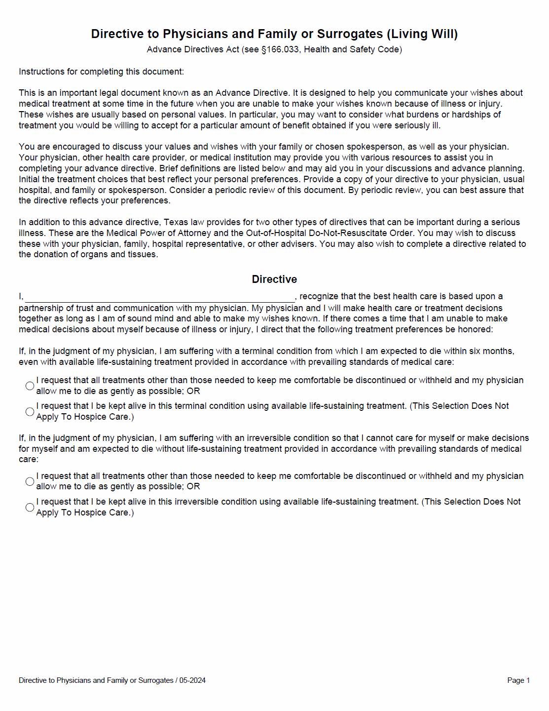 TX HHS Directive to Physicians and Family or Surrogates (Living Will)