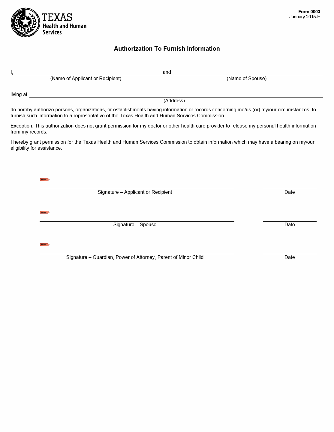 The Texas Health and Human Services (HHS) Form 0003, Authorization to Furnish Information, is used by applicants or recipients to authorize the release of personal information to representatives of the Texas HHS Commission. This form enables individuals to grant permission for relevant parties to share information that may impact their eligibility for assistance programs.