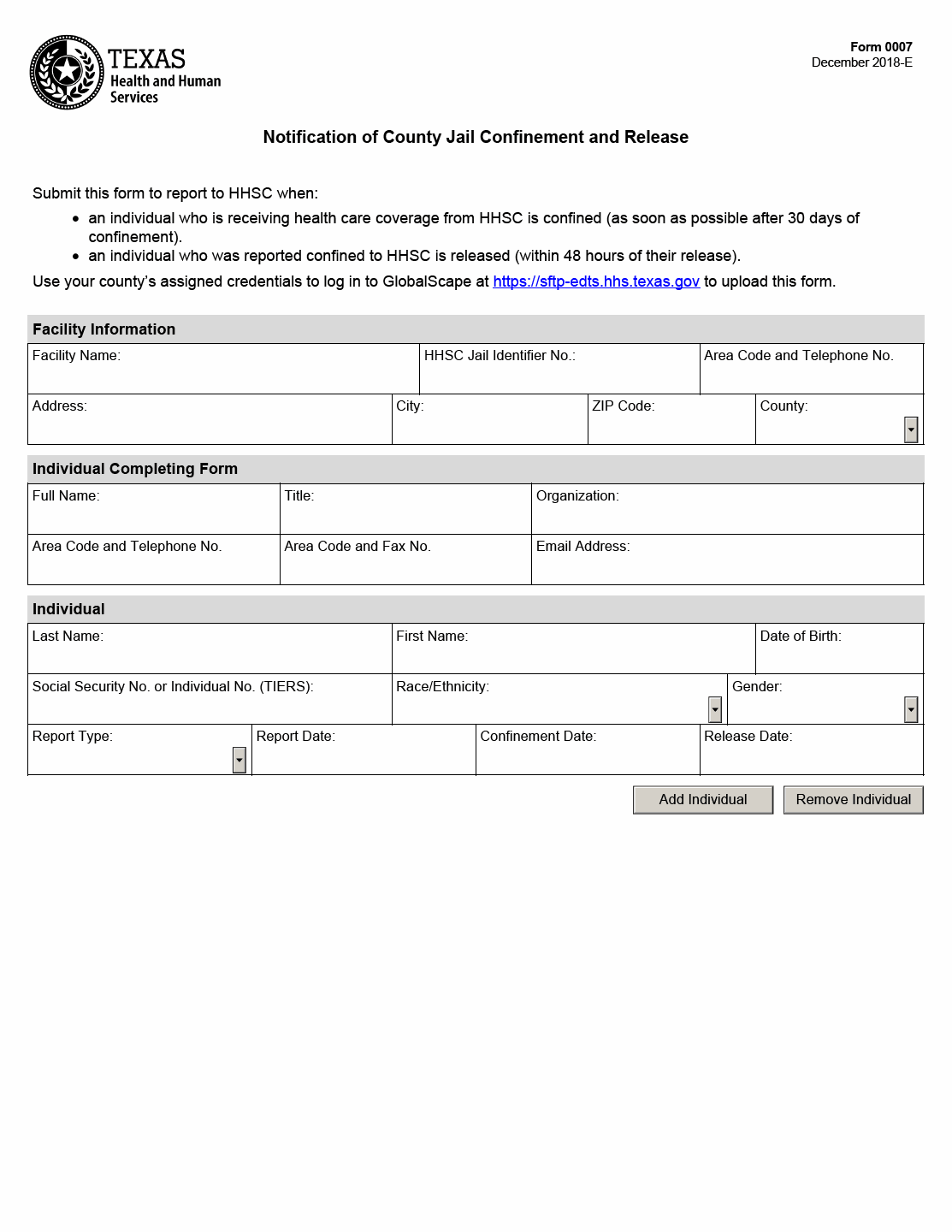 TX HHS Form 0007. Notification of County Jail Confinement and Release