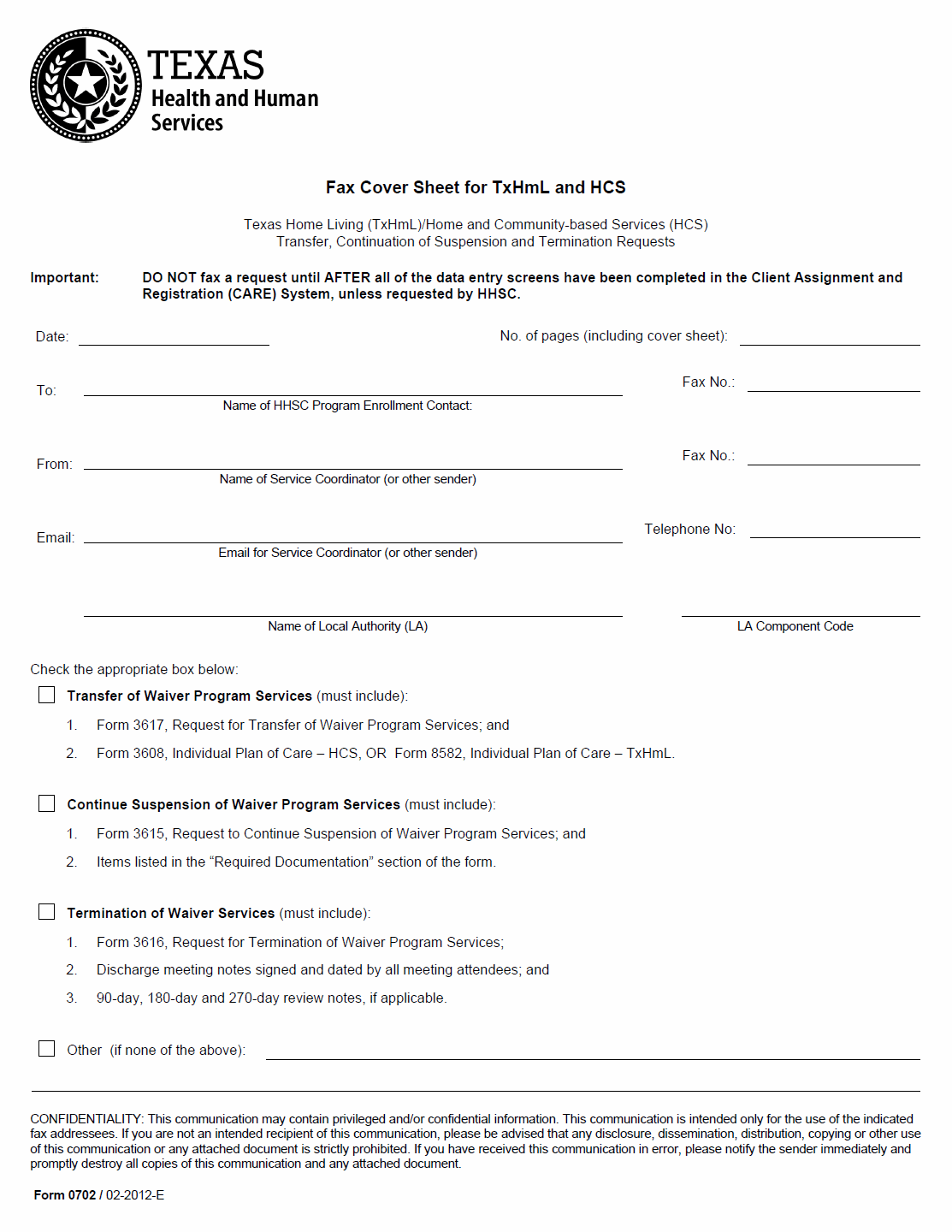 TX HHS Form 0702. Fax Cover Sheet for TxHmL and HCS