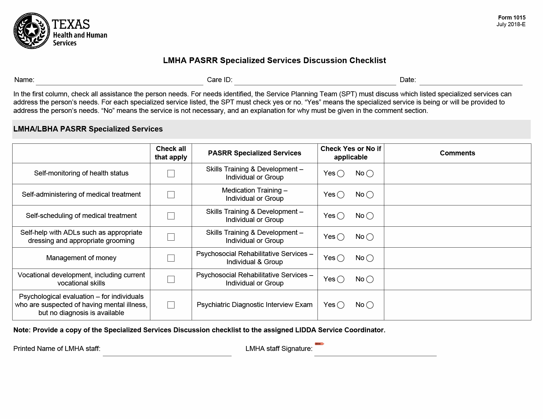 TX HHS Form 1015. LMHA PASRR Specialized Services Discussion Checklist