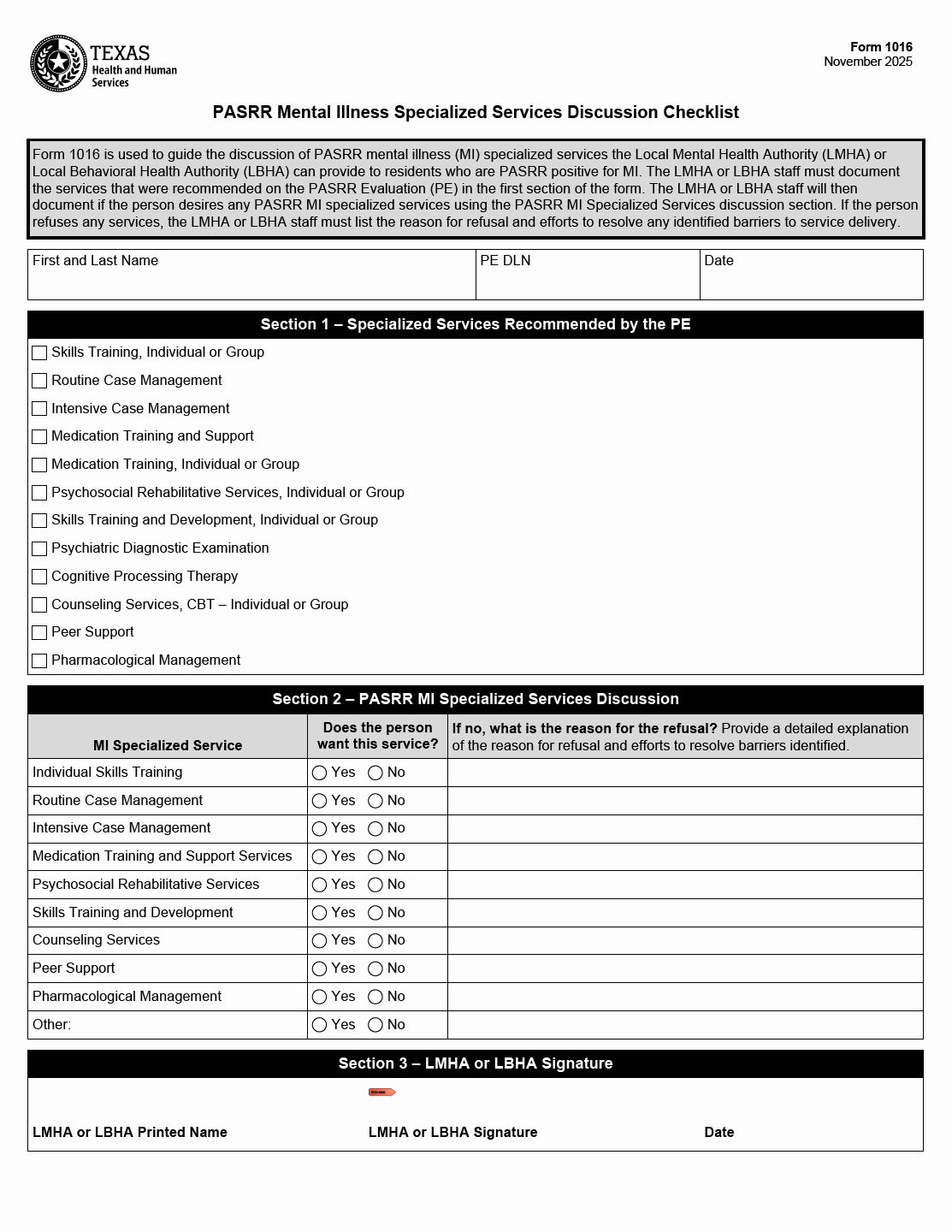 TX HHS Form 1016. PASRR Mental Illness Specialized Services Discussion Checklist