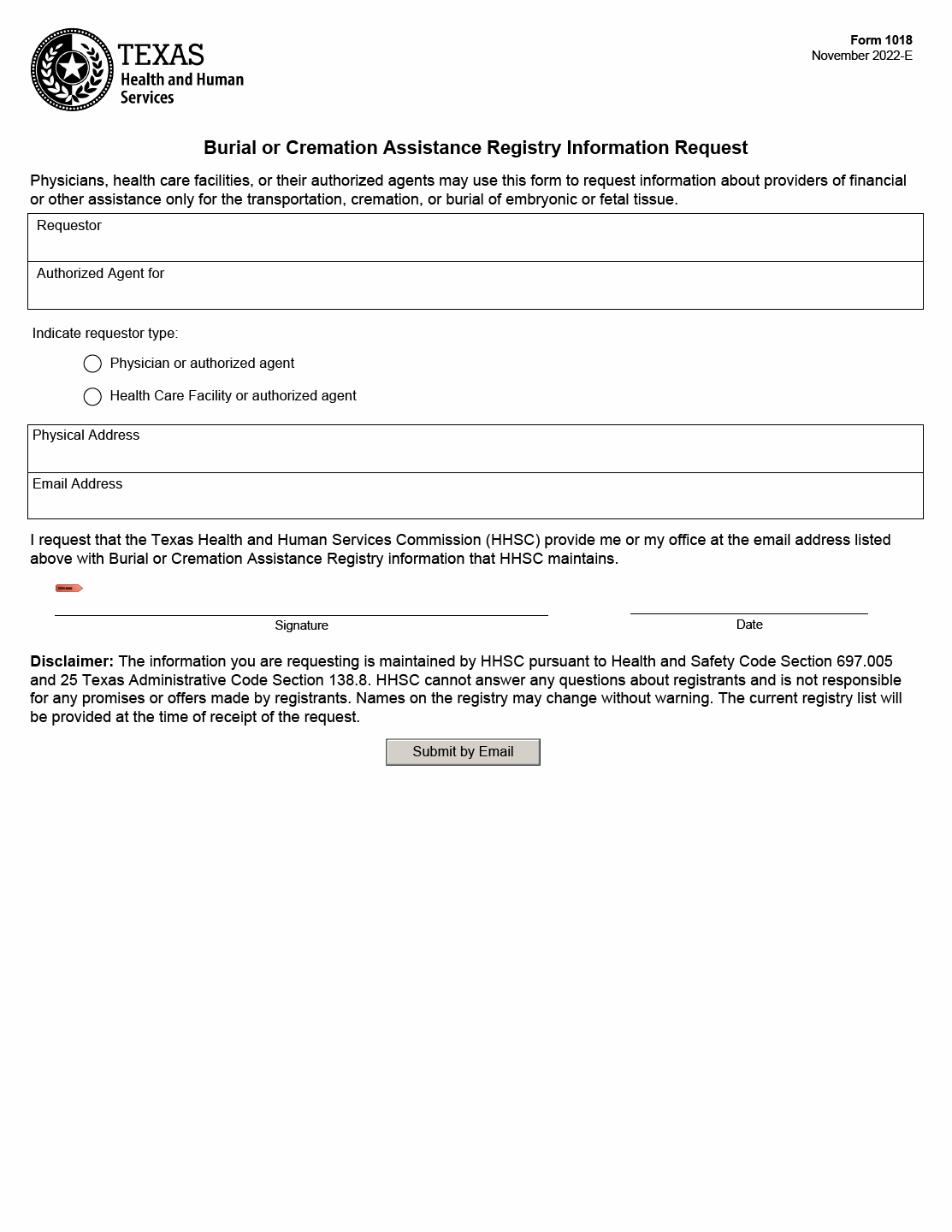 TX HHS Form 1018. Burial or Cremation Assistance Registry Information Request