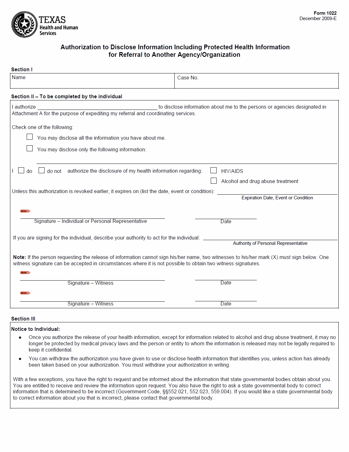 TX HHS Form 1022. Authorization to Disclose Information Including Protected Health Information for Referral to Another Agency/Organization