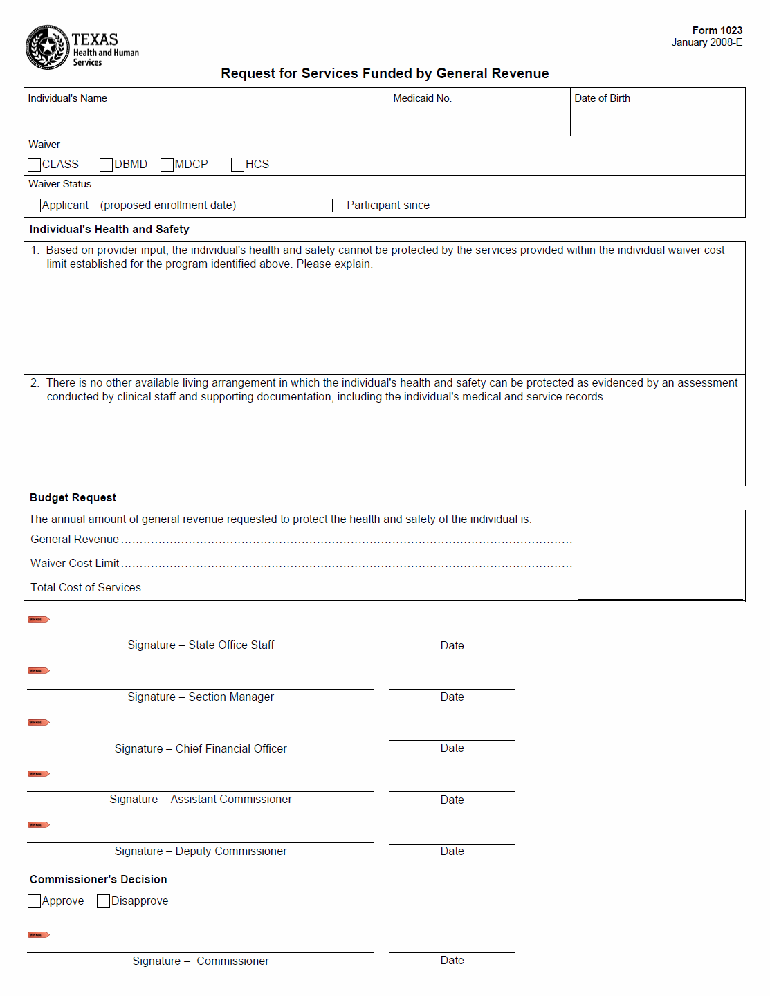 The Form 1023 is issued by the Texas Health and Human Services (HHS) and is used to facilitate the provision of services that are funded through general revenue. This document requires signatures from various officials, including the Commissioner's decision, indicating approval or disapproval of the requested services and funding. The form plays a critical role in ensuring that individuals receive the necessary support and care to maintain their health and safety.