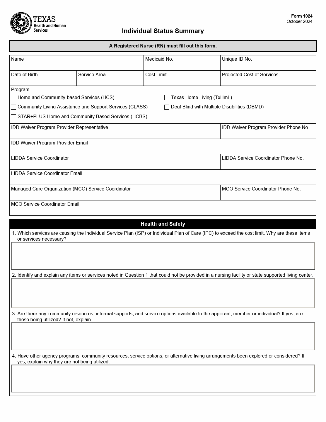 The Individual Status Summary (Form 1024) is a crucial document issued by the Texas Health and Human Services (HHS). This form is designed to provide a comprehensive overview of an individual's status, highlighting their unique needs and requirements. A Registered Nurse (RN) must complete this form, ensuring that all necessary information is accurately recorded.