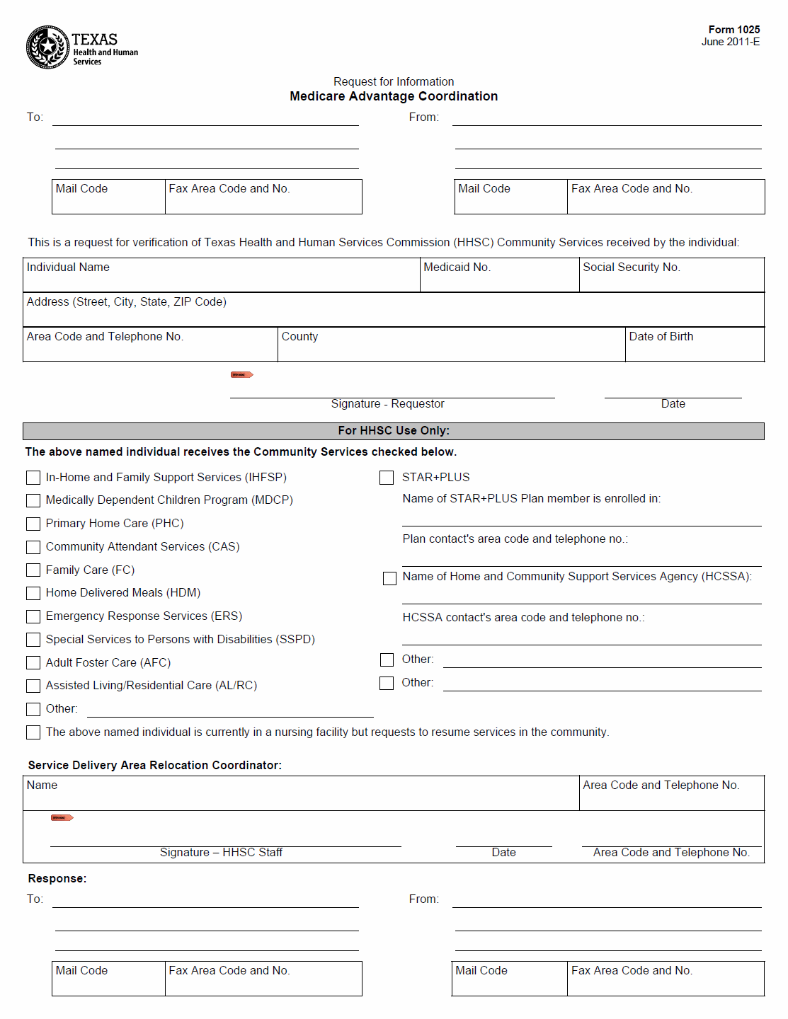 TX HHS Form 1025. Request for Information Medicare Advantage Coordination