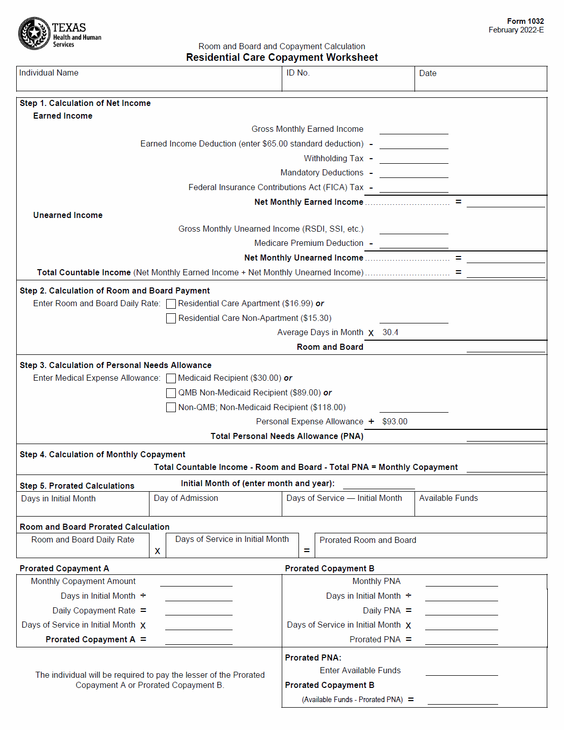 TX HHS Form 1032. Residential Care Copayment Worksheet
