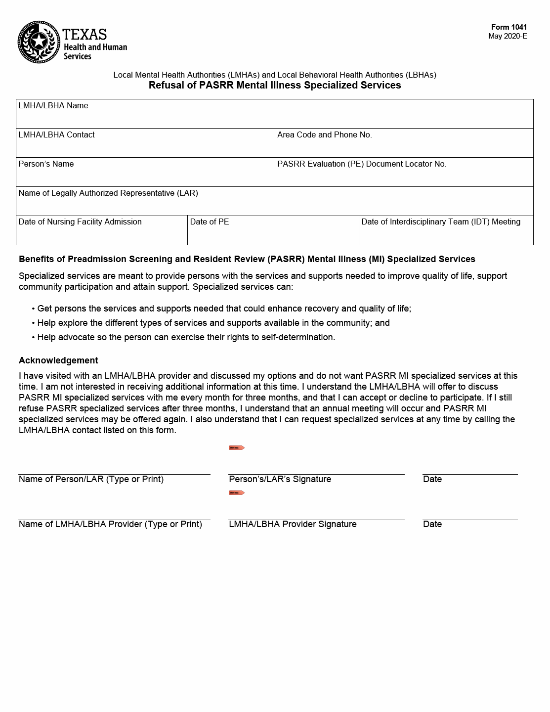 TX HHS Form 1041. Refusal of PASRR Mental Illness Specialized Services