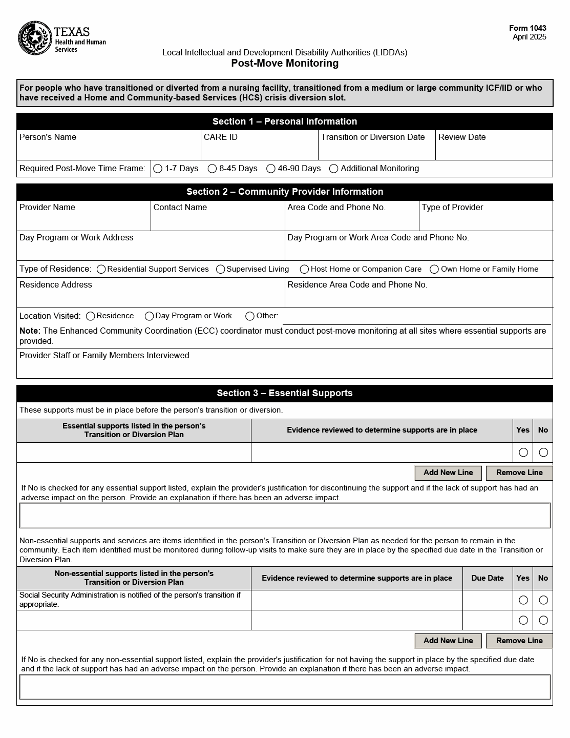 TX HHS Form 1043. Post-Move Monitoring