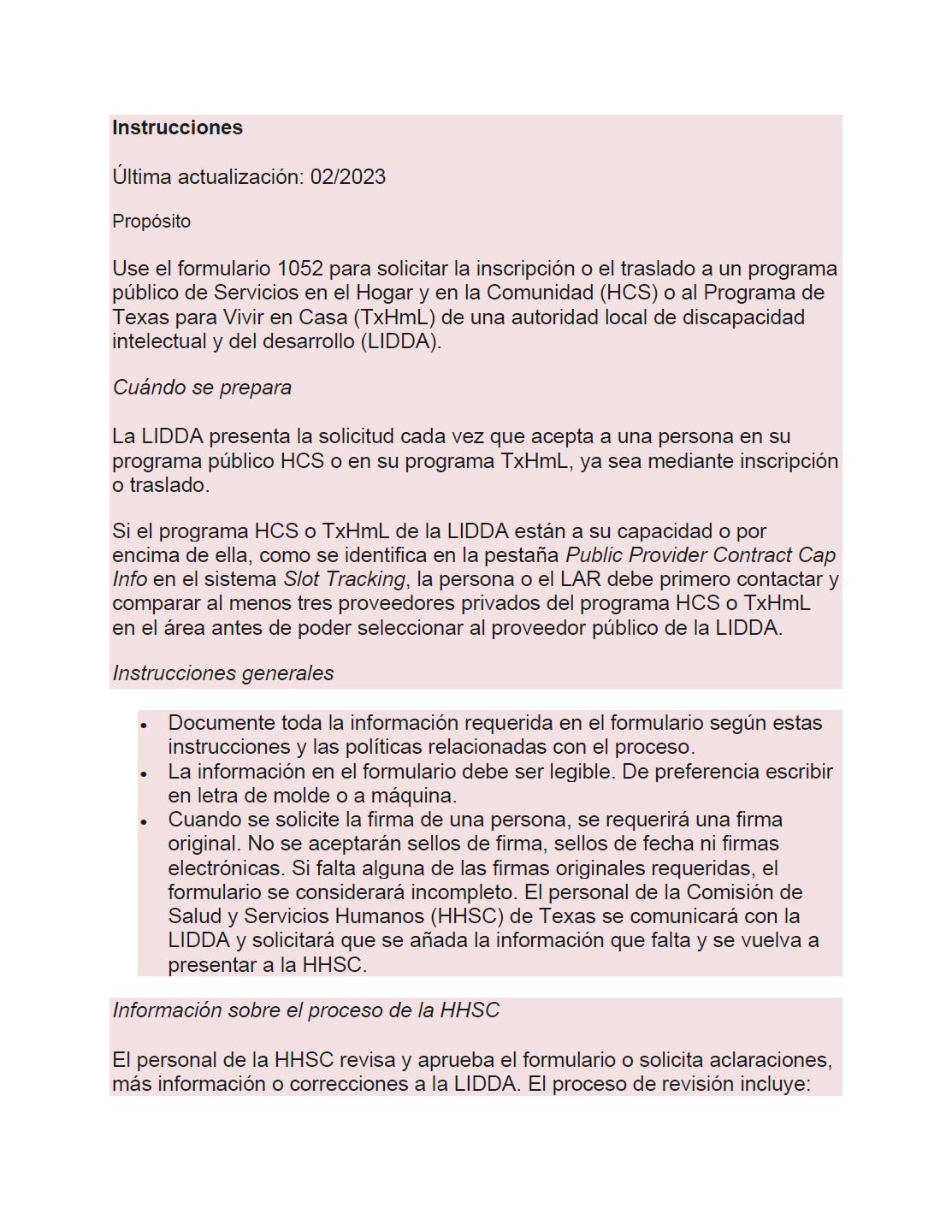 The Public Provider Choice Request form (TX HHS Form 1052) helps solve the problem of requesting enrollment or transfer to a public program for Home and Community Services (HCS) or Texas Home Living (TxHmL) with a local intellectual disability and developmental authority. This form is typically used by local authorities when accepting individuals into their programs, whether through initial enrollment or transfer.