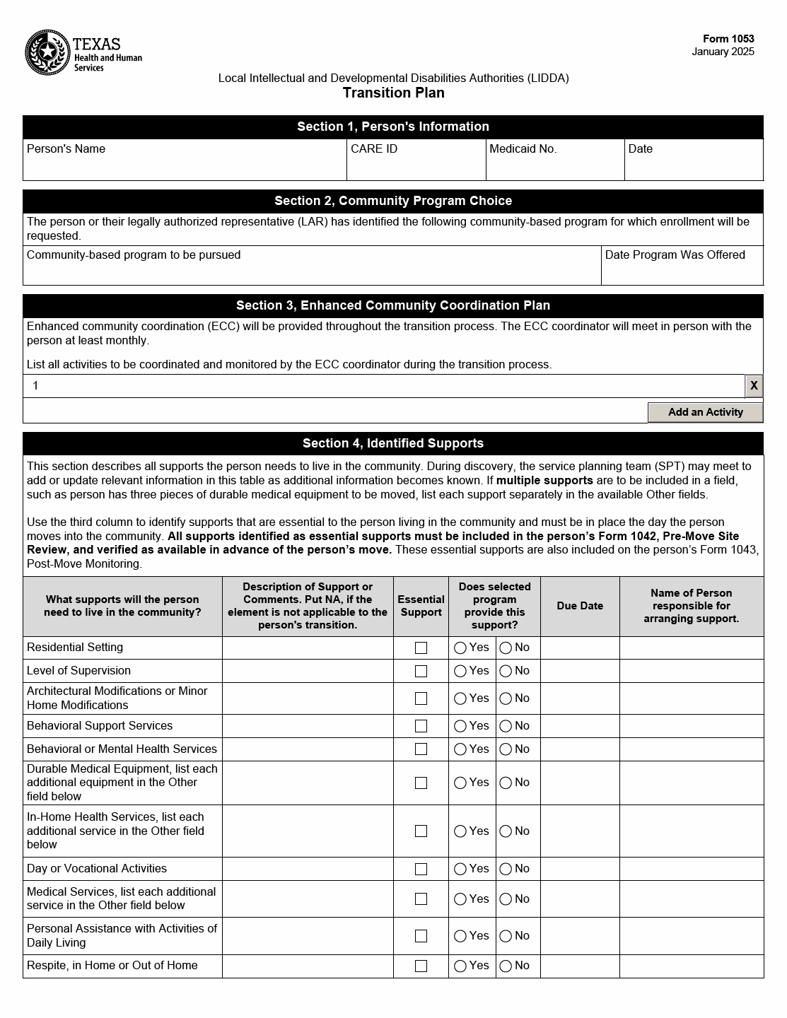 This document is designed for use by Local Intellectual and Developmental Disabilities Authorities (LIDDAs) in Texas, as well as other stakeholders involved in the transition process. The Form 1053 provides a structured framework for LIDDAs to develop and implement effective transition plans that promote independence, self-determination, and community integration for individuals with intellectual and developmental disabilities.