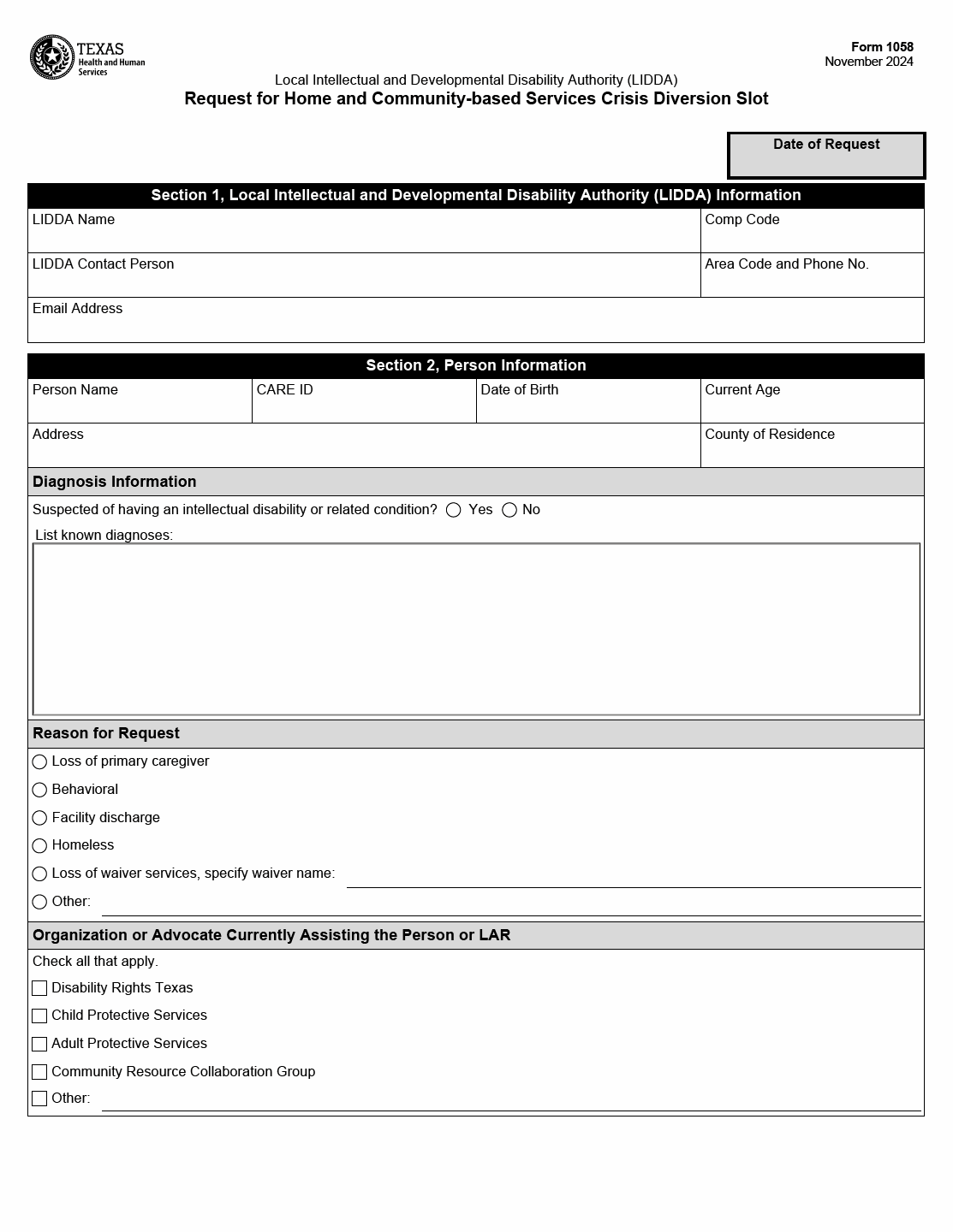 TX HHS Form 1058. Request for Home and Community-based Services Crisis Diversion Slot