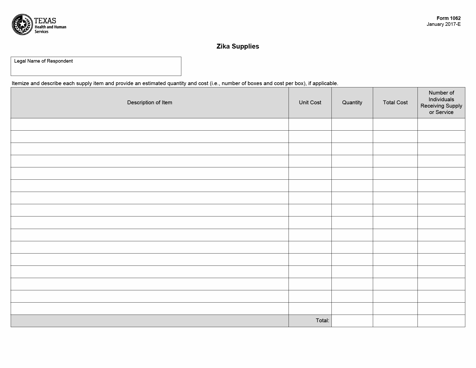 TX HHS Form 1062. Zika Supplies