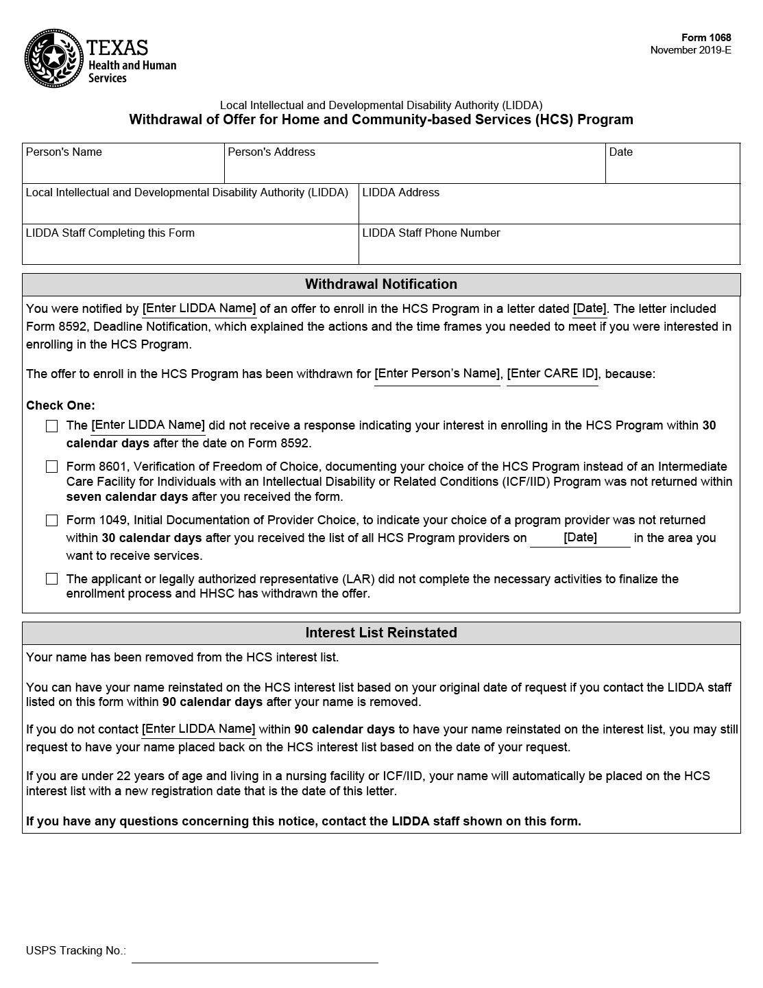 This form is intended for individuals who have received an offer to enroll in the HCS program and need to be notified of the withdrawal of their offer. The issuing agency, Texas Health and Human Services (HHS), has developed this form to ensure that individuals are properly informed of the status of their enrollment application. By using Form 1068, LIDDA can efficiently manage the HCS program and provide services to eligible individuals in a timely manner.