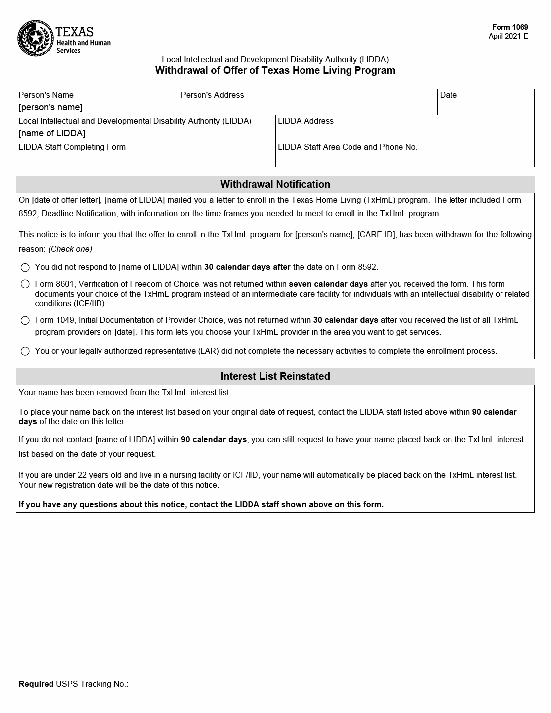 TX HHS Form 1069. Withdrawal of Offer of Texas Home Living Program
