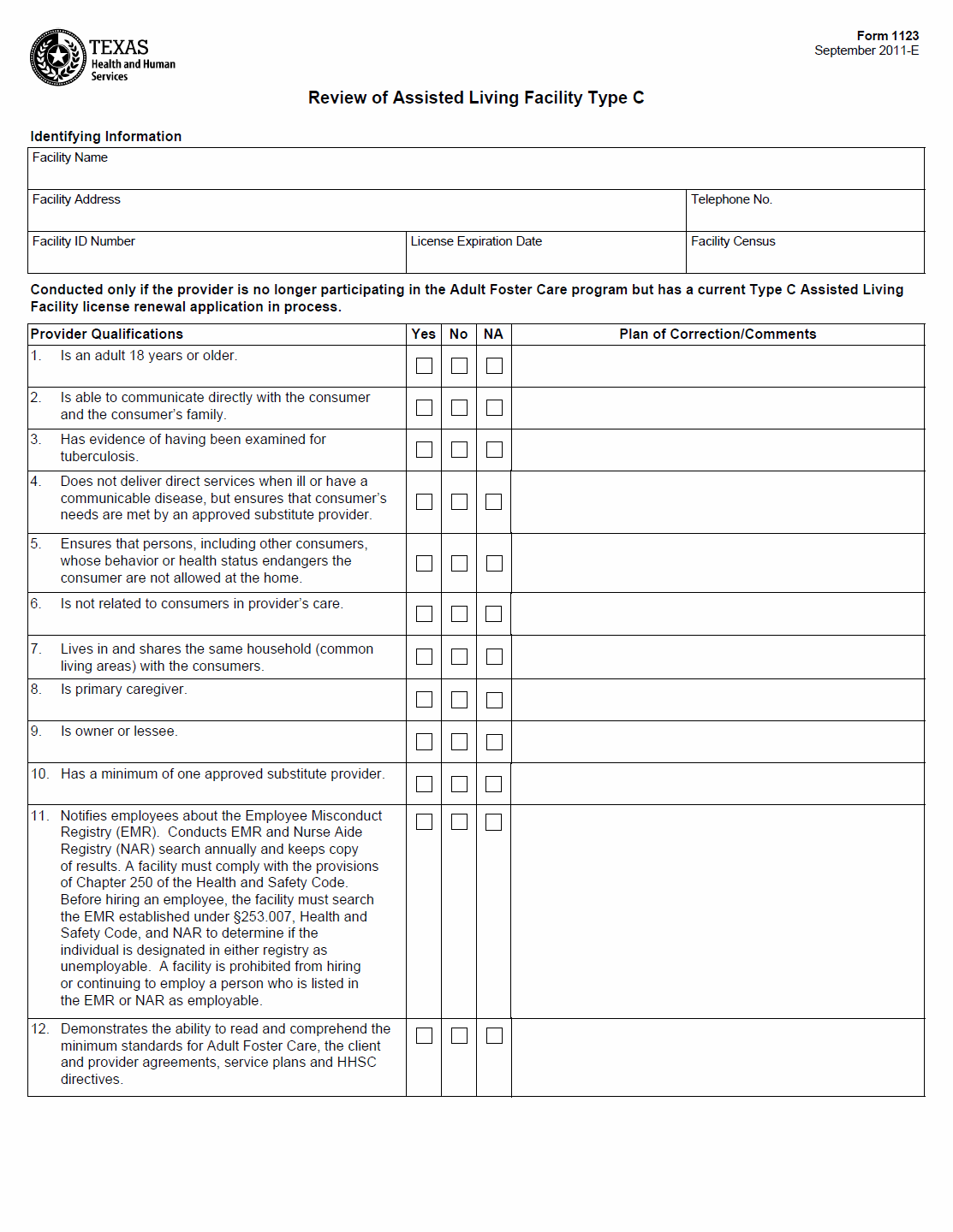 TX HHS Form 1123. Review of Assisted Living Facility Type C