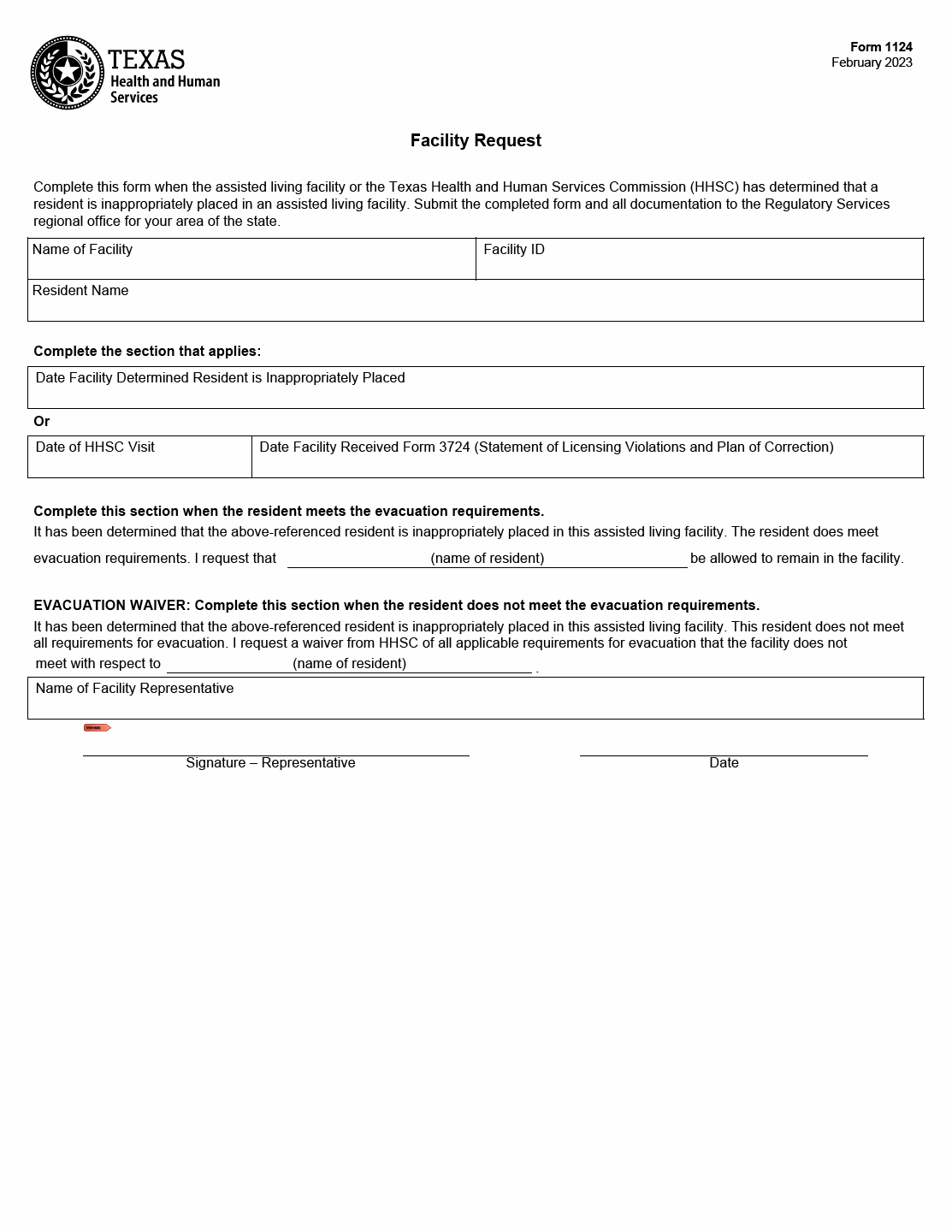 The Texas Health and Human Services (HHS) Form 1124, Facility Request, is a crucial document used to request permission for a resident to remain in an assisted living facility despite not meeting evacuation requirements. This form is essential when the facility or HHS determines that a resident is inappropriately placed.