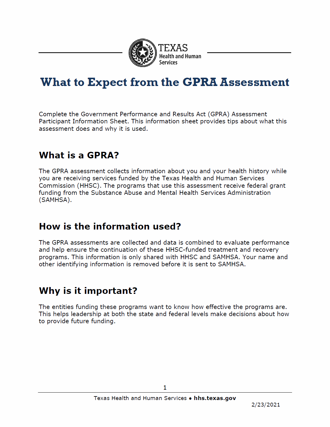 The GPRA assessment collects personal and health history information, which is combined with data from other participants to assess program performance. The information is shared only with HHSC and the Substance Abuse and Mental Health Services Administration (SAMHSA). This helps leadership at both state and federal levels make informed decisions about future funding.