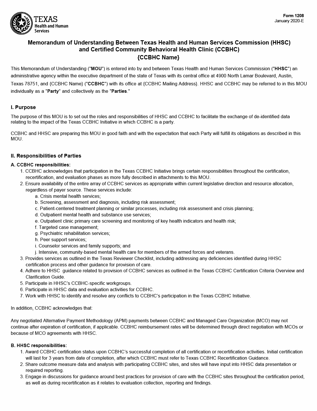 TX HHS Form 1208. Memorandum of Understanding Between Texas Health and Human Services Commission (HHSC) and Certified Community Behavioral Health Clinic (CCBHC)