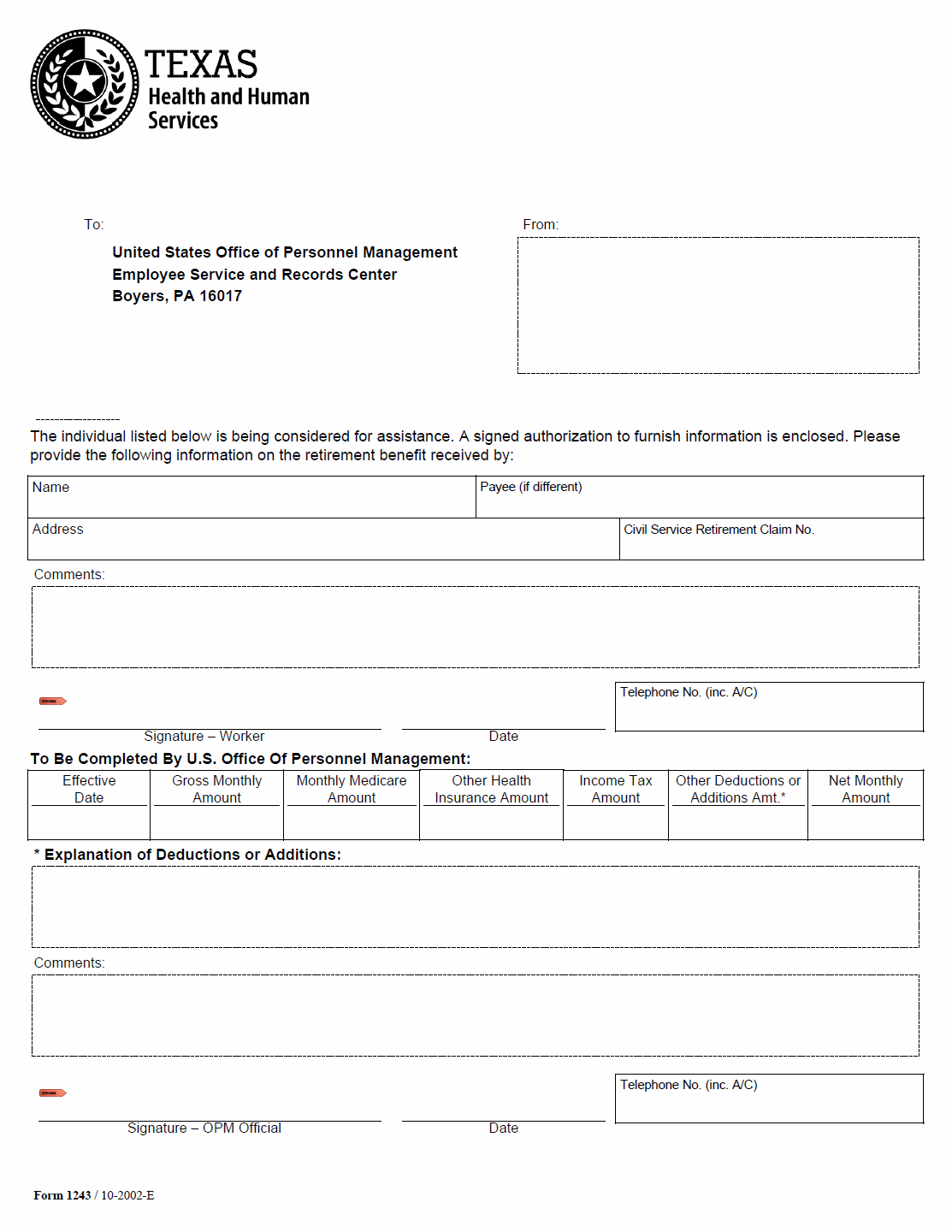 This form is intended for use by individuals seeking assistance through the Texas HHS program, as well as by the U.S. Office of Personnel Management (OPM) in verifying the accuracy of retirement benefit information. The issuance agency responsible for this form is the Texas Health and Human Services department. Form 1243 was last updated in October 2002.