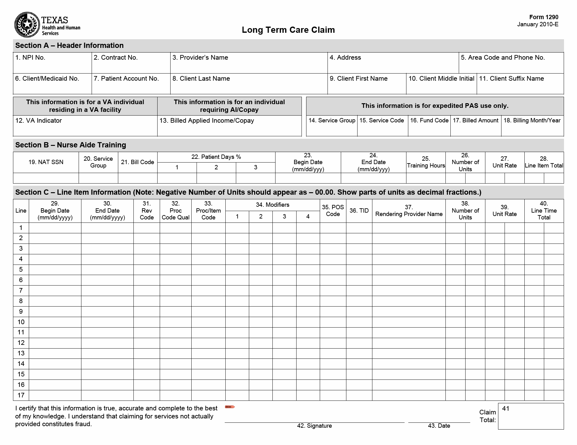 The Texas Health and Human Services (HHS) Form 1290, Long Term Care Claim, is a crucial document for healthcare providers to claim reimbursement for services provided to patients. This form serves as a comprehensive tool for healthcare professionals to accurately report the services rendered, including nurse aide training and line item information.