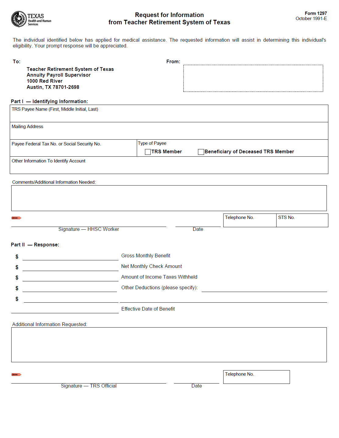 TX HHS Form 1297. Request for Information from Teacher Retirement System of Texas