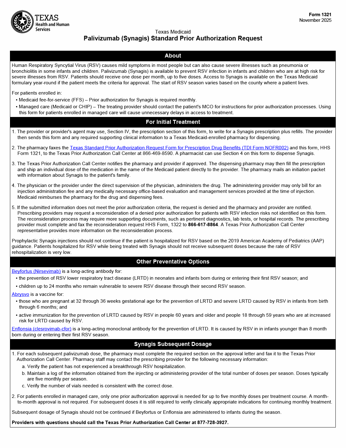 TX HHS Form 1321. Texas Medicaid Palivizumab (Synagis) Standard Prior Authorization Request