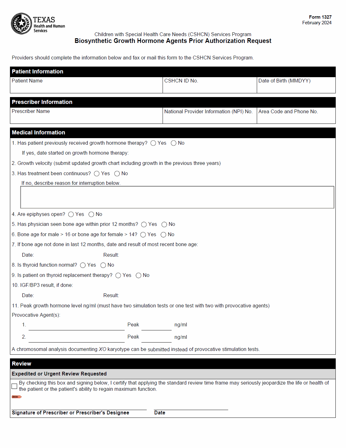 TX HHS Form 1327. Biosynthetic Growth Hormone Agents Prior Authorization Request (CSHCN)