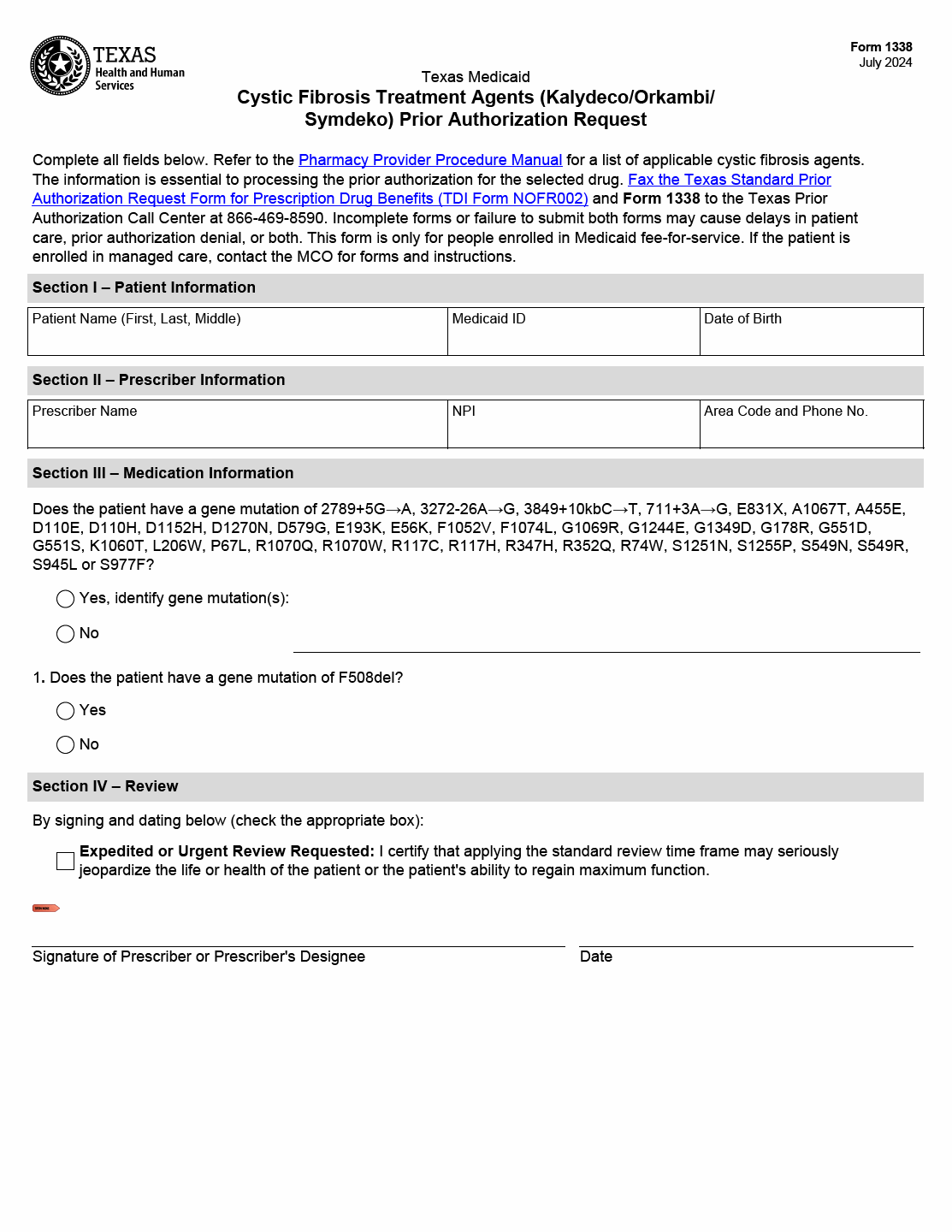 TX HHS Form 1338. Cystic Fibrosis Treatment Agents (Kalydeco/Orkambi/Symdeko) Prior Authorization Request
