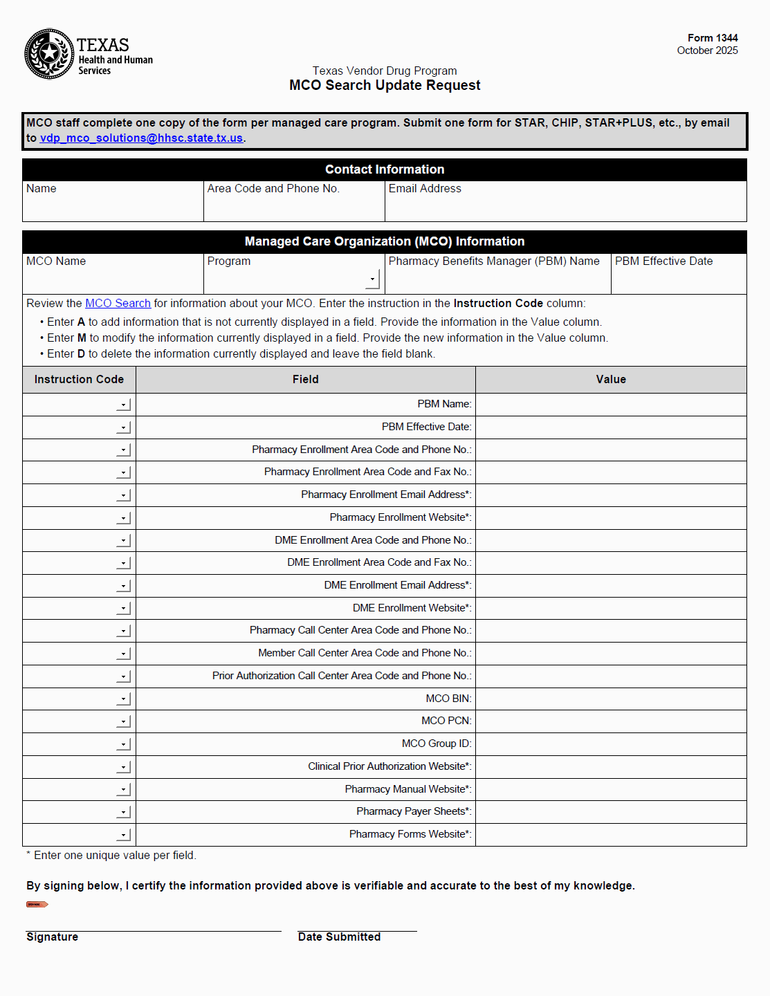 TX HHS Form 1344. Texas Vendor Drug Program MCO Search Update Request