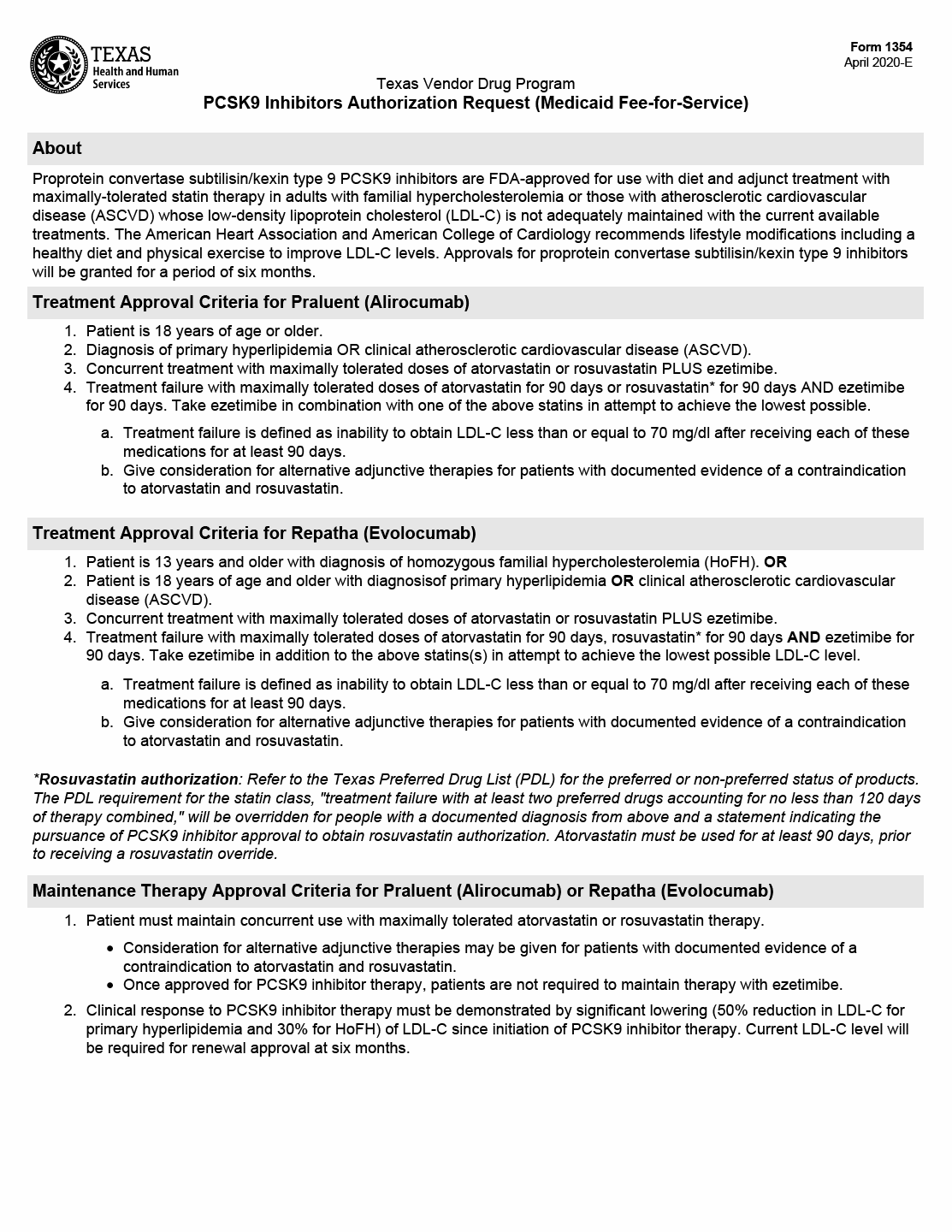 TX HHS Form 1354. PCSK9 Inhibitors Authorization Request (Medicaid Fee-for-Service)