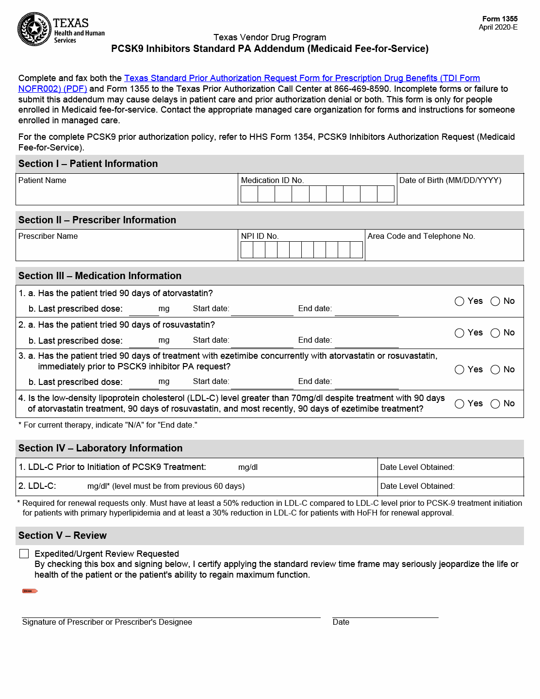 TX HHS Form 1355. PCSK9 Inhibitors Standard PA Addendum (Medicaid Fee-for-Service)