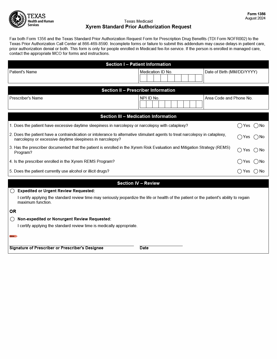 TX HHS Form 1356. Texas Medicaid Xyrem Prior Authorization Request