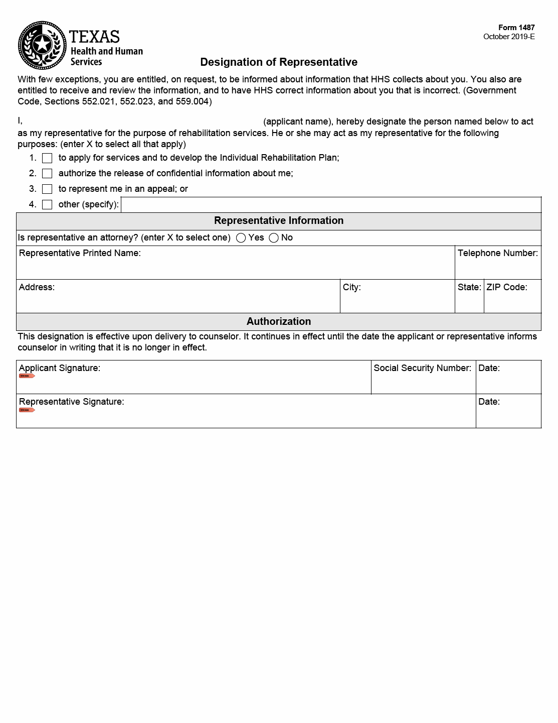 The Texas Health and Human Services (HHS) Form 1487, Designation of Representative, allows individuals to designate a representative to act on their behalf for the purpose of rehabilitation services. This form is used to authorize a representative to apply for services, develop an Individual Rehabilitation Plan, release confidential information, or represent the individual in an appeal.