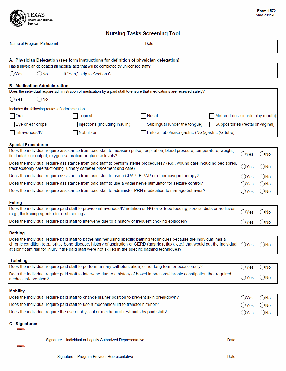 TX HHS Form 1572. Nursing Tasks Screening Tool