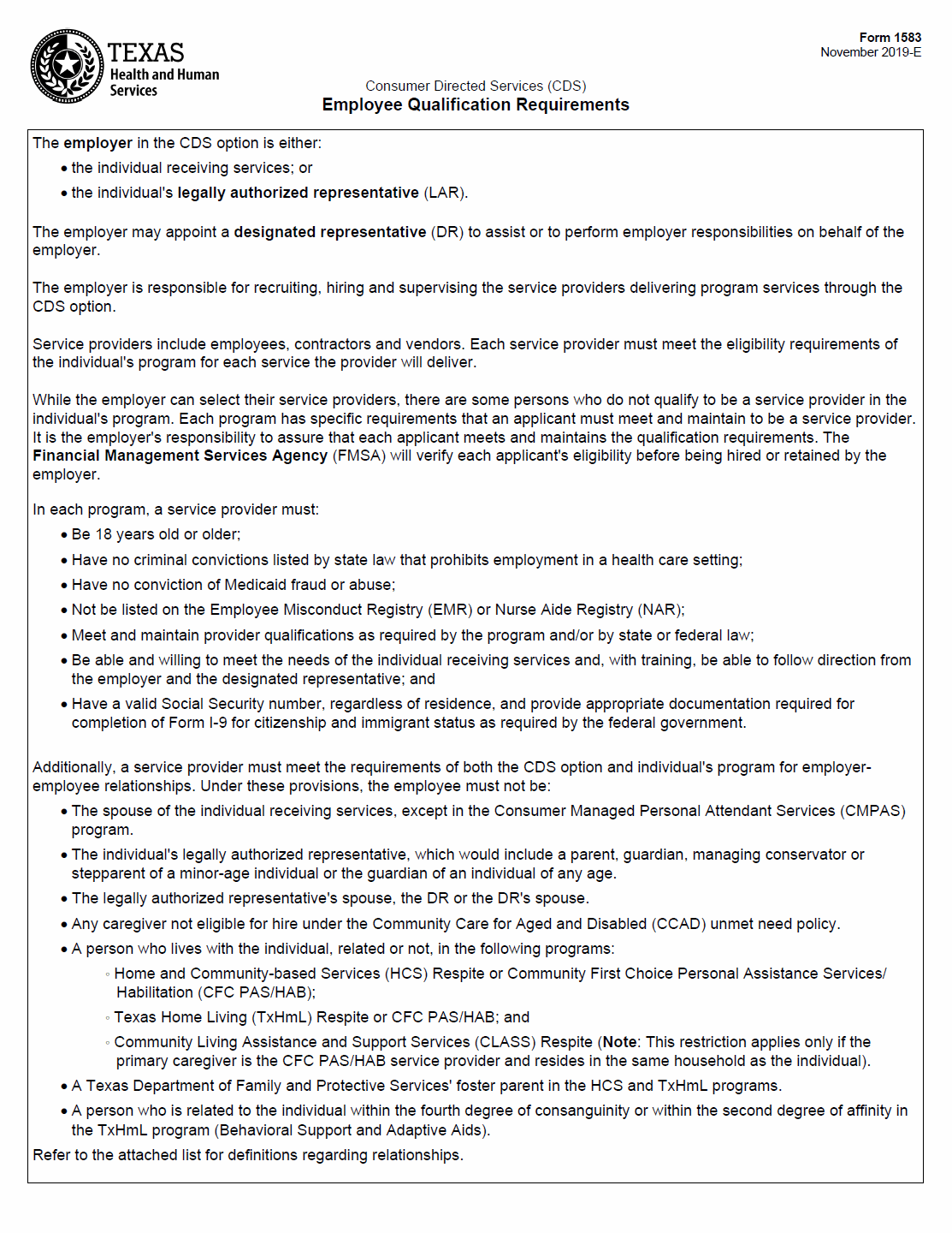The Texas Health and Human Services (HHS) Form 1583, Employee Qualification Requirements, outlines the essential criteria for service providers delivering program services through the Consumer Directed Services (CDS) option. The employer, either the individual receiving services or their legally authorized representative, is responsible for recruiting, hiring, and supervising these service providers.
