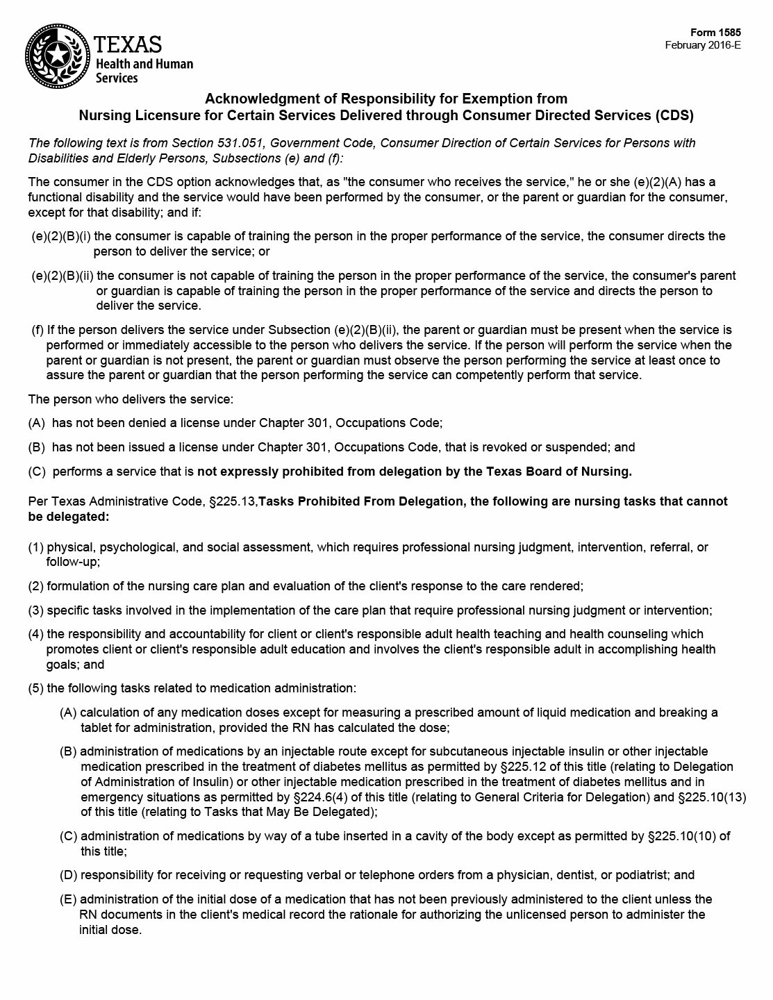 TX HHS Form 1585. Acknowledgement of Responsibility for Exemption from Nursing Licensure for Certain Services Delivered through Consumer Directed Services