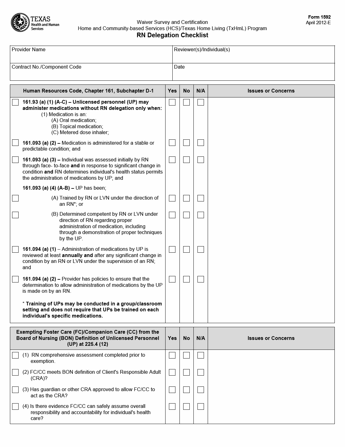 The Texas Health and Human Services (HHS) Form 1592, RN Delegation Checklist, is a crucial tool for ensuring the safe administration of medications by unlicensed personnel (UPs) in Home and Community-based Services (HCS)/Texas Home Living (TxHmL) Program settings. This comprehensive checklist outlines the necessary conditions and requirements for UPs to administer medications without direct supervision from a registered nurse (RN).
