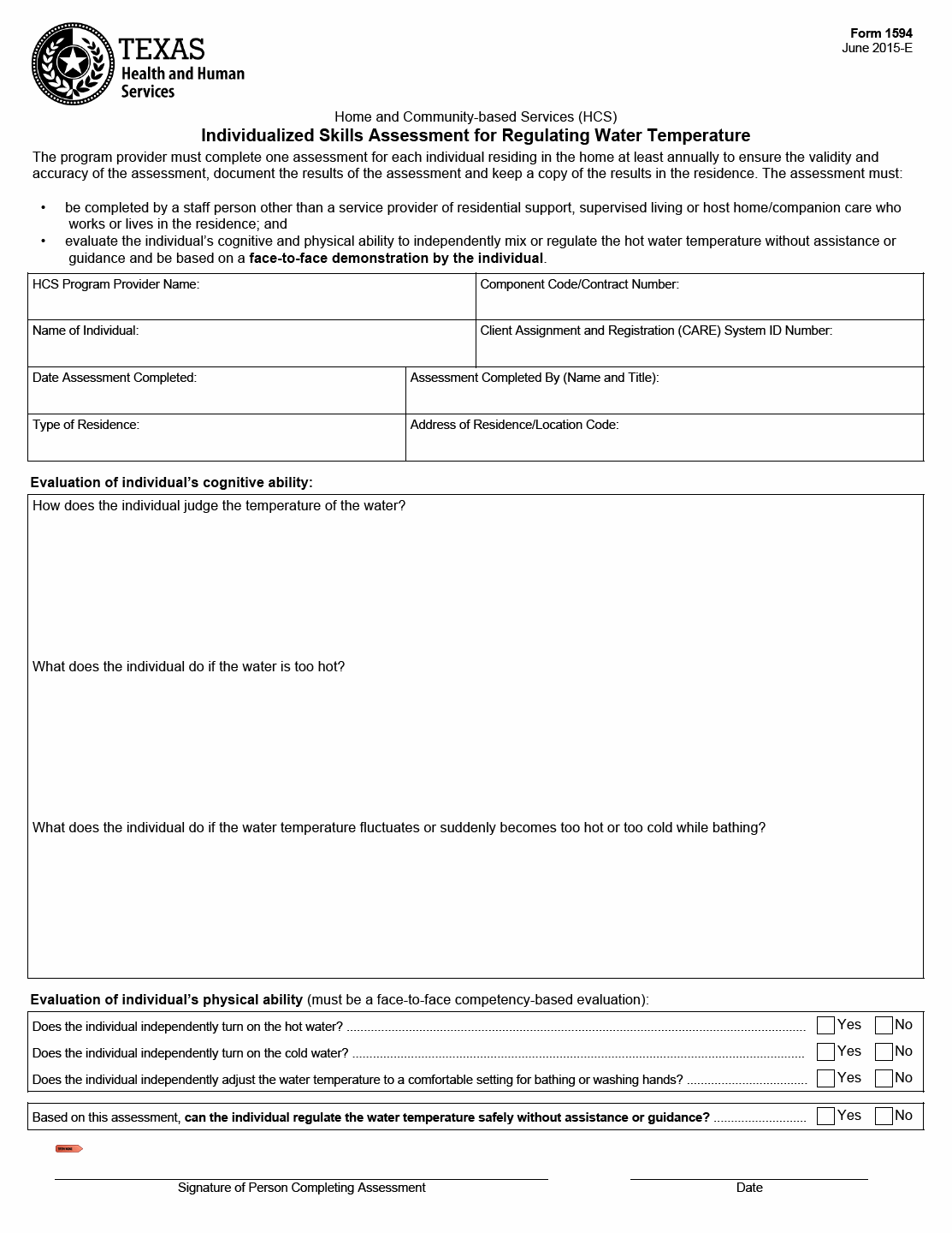 The Individualized Skills Assessment for Regulating Water Temperature (TX HHS Form 1594) is a critical tool used by the Texas Health and Human Services (HHS) to evaluate an individual's ability to safely regulate water temperature without assistance or guidance. This assessment is designed to ensure the validity and accuracy of the evaluation, which must be completed annually for each individual residing in the home.
