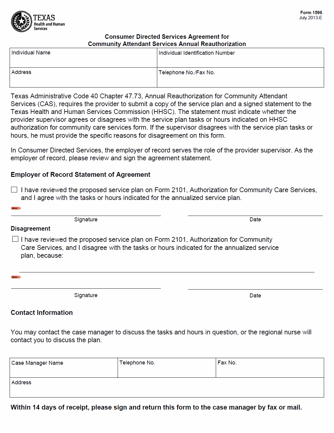 TX HHS Form 1596. Consumer Directed Services Agreement for Community Attendant Services Annual Reauthorization