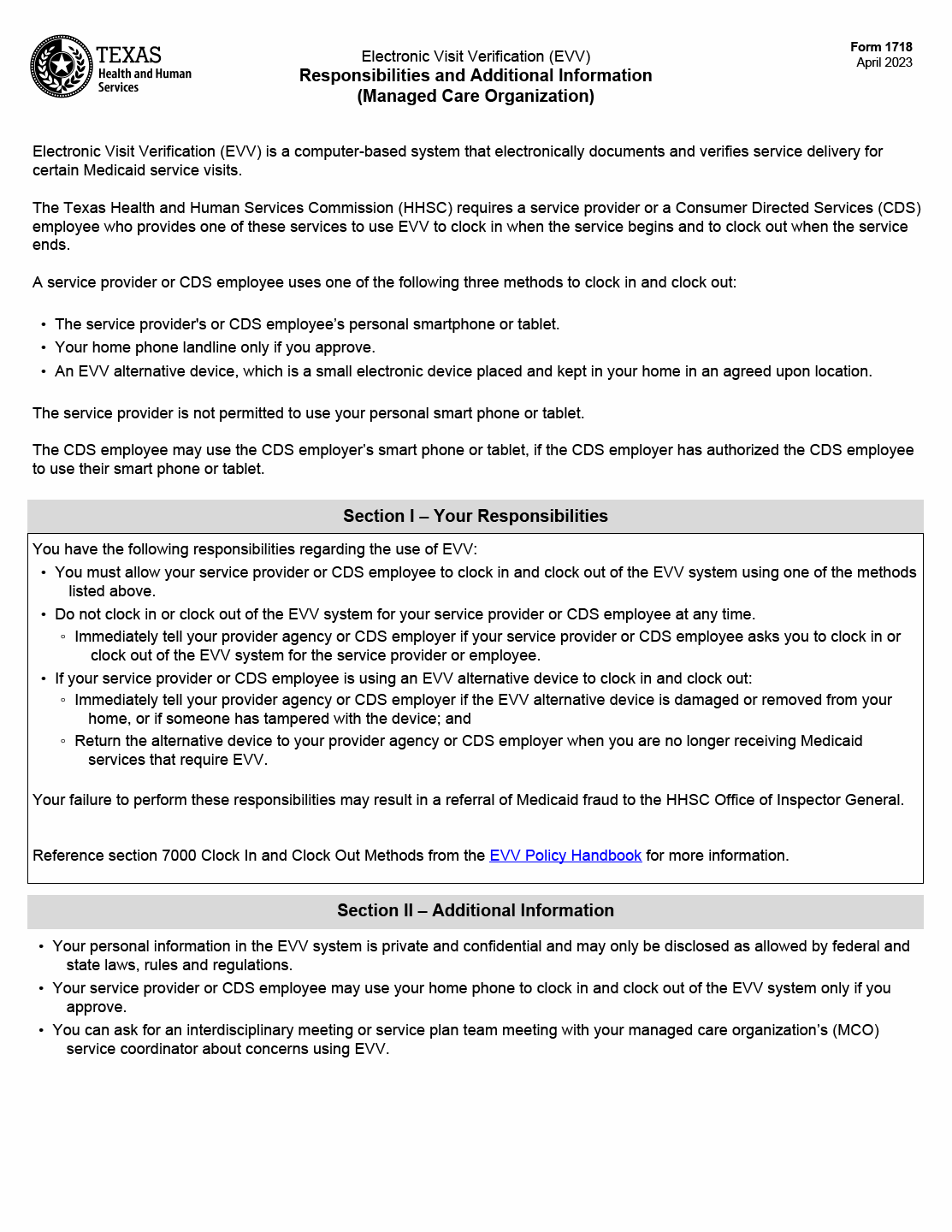 TX HHS Form 1718. Electronic Visit Verification (EVV) Responsibilities and Additional Information (Managed Care Organization)